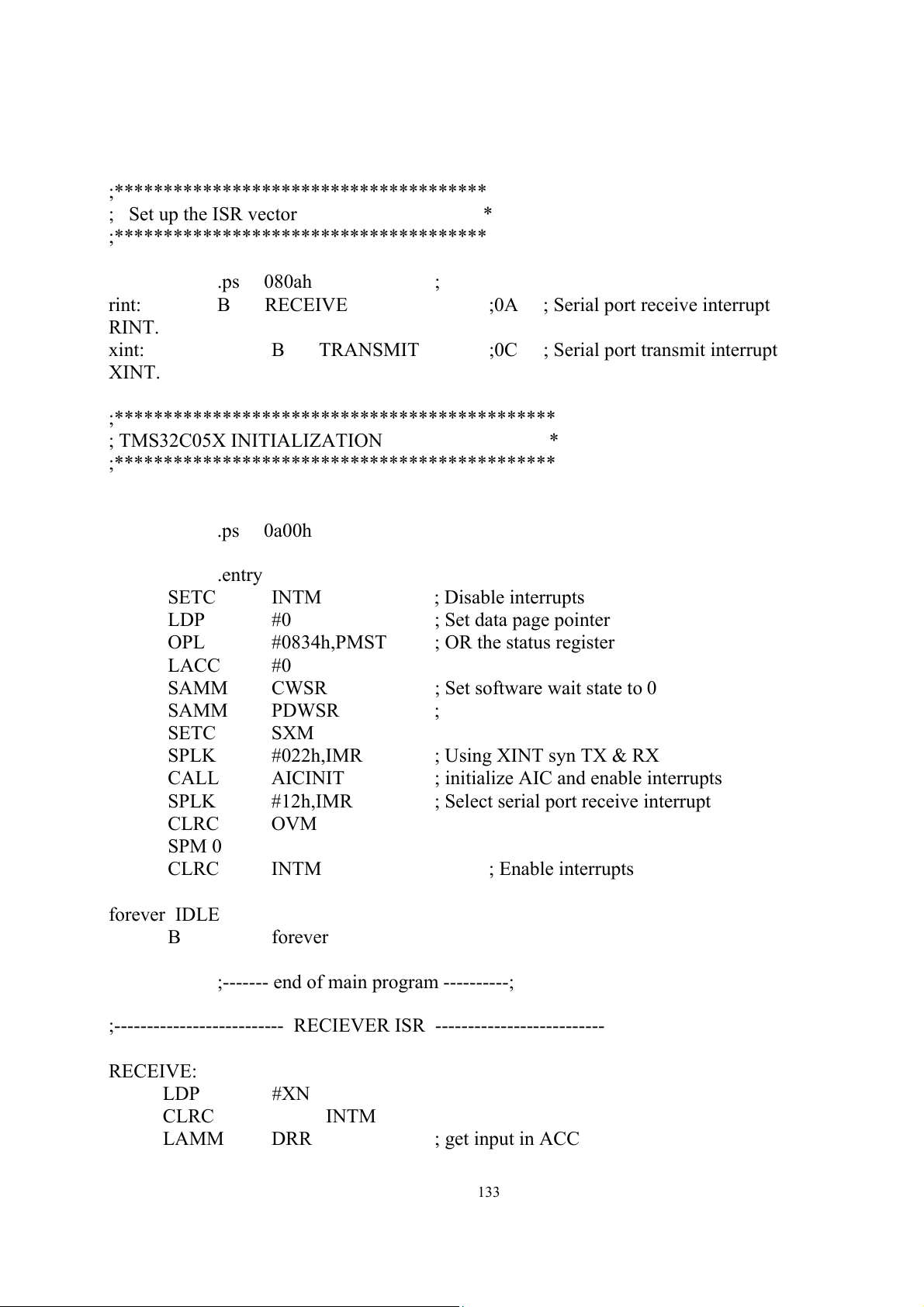 ; Select serial port receive interrupt CLRC OVM SPM 0 CLRC INTM ; Enable interrupts forever IDLE B forever
