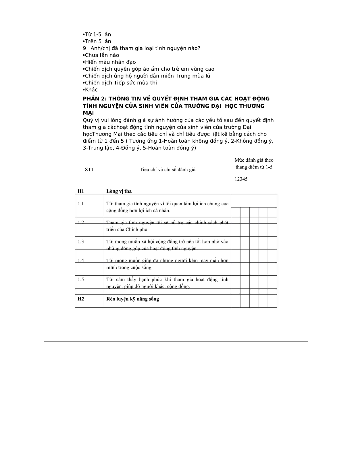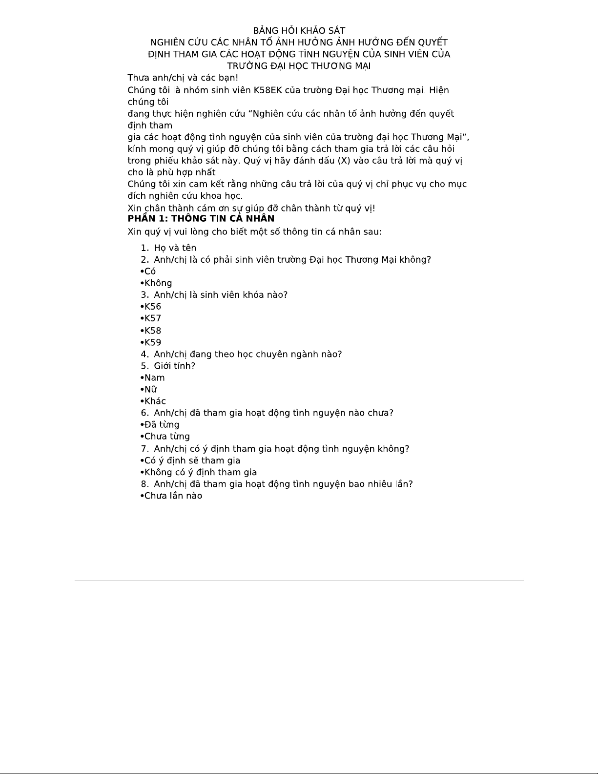 Khảo sát K58EK: Các yếu tố ảnh hưởng đến tình nguyện sinh viên Thương Mại