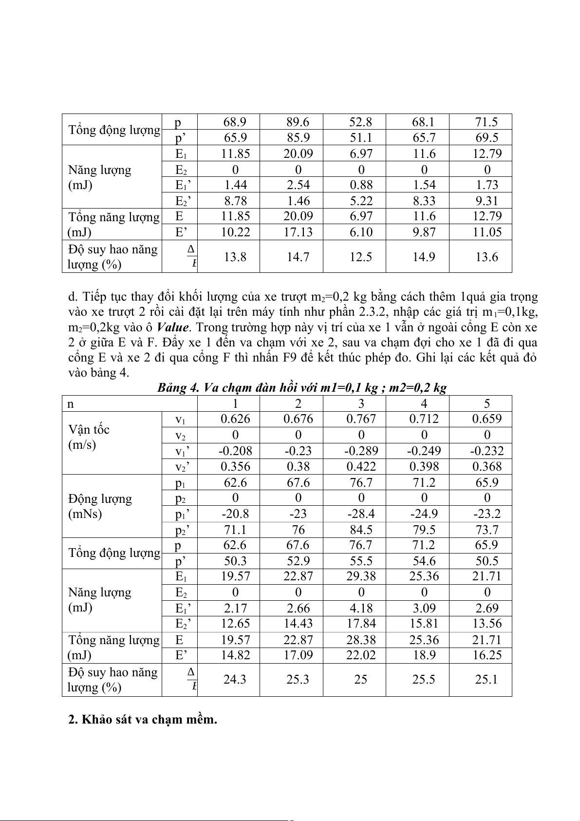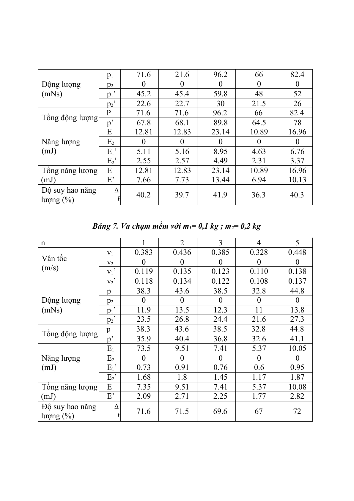 Bảng 5. Va chạm mềm với m1=m2=0,1 kg n 1 2 3 4 5 v1 0.438 0.452 0.441 0.426 0.311 Vận tốc v (m/s) 2 0 0 0 0 0 v1’ 0.201 0.208 0.202 0.199 0.146 v2’ 0.201 0.208 0.202 0.199 0.146 p1 43.8 45.2 44.1 42.6 31.1 Động lượng p2 0 0 0 0 0 (mNs) p1’ 20.1 20.8 20.2 19.9 14.6 p2’ 20.1 20.8 20.2 19.9 14.6 p 43.8 45.2 44.1 42.6 31.1 Tổng động lượng p’ 40.2 41.5 40.4 39.8 29.2 E1 9.60 10.2 9.73 9.07 4.83 Năng lượng E2 0 0 0 0 0 (mJ) E1’ 2.02 2.15 2.03 1.98 1.07 E2’ 2.03 2.16 2.04 1.99 1.06 Tổng năng lượng E 9.6 10.2 9.73 9.07 4.83 (mJ) E’ 4.05 4.31 4.08 3.97 2.14 Độ suy hao năng ∆ 57.9 57.7 58.1 56.3 55.8 lượng (%) E