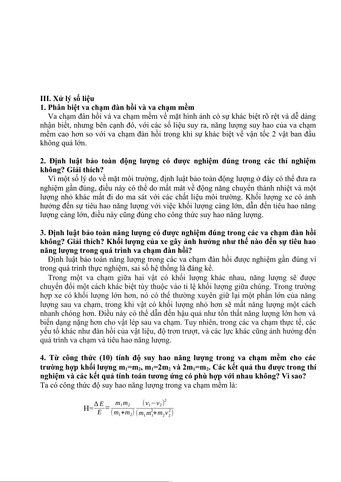 Bảng 7. Va chạm mềm với m1= 0,1 kg ; m2= 0,2 kg n 1 2 3 4 5 v1 0.383 0.436 0.385 0.328 0.448 Vận tốc v (m/s) 2 0 0 0 0 0 v1’ 0.119 0.135 0.123 0.110 0.138 v2’ 0.118 0.134 0.122 0.108 0.137 p1 38.3 43.6 38.5 32.8 44.8 Động lượng p2 0 0 0 0 0 (mNs) p1’ 11.9 13.5 12.3 11 13.8 p2’ 23.5 26.8 24.4 21.6 27.3 p 38.3 43.6 38.5 32.8 44.8 Tổng động lượng p’ 35.9 40.4 36.8 32.6 41.1 E1 73.5 9.51 7.41 5.37 10.05 Năng lượng E2 0 0 0 0 0 (mJ) E1’ 0.73 0.91 0.76 0.6 0.95 E2’ 1.68 1.8 1.45 1.17 1.87 Tổng năng lượng E 7.35 9.51 7.41 5.37 10.08 (mJ) E’ 2.09 2.71 2.25 1.77 2.82 Độ suy hao năng ∆ 71.6 71.5 69.6 67 72 lượng (%) E III. Xử lý số liệu