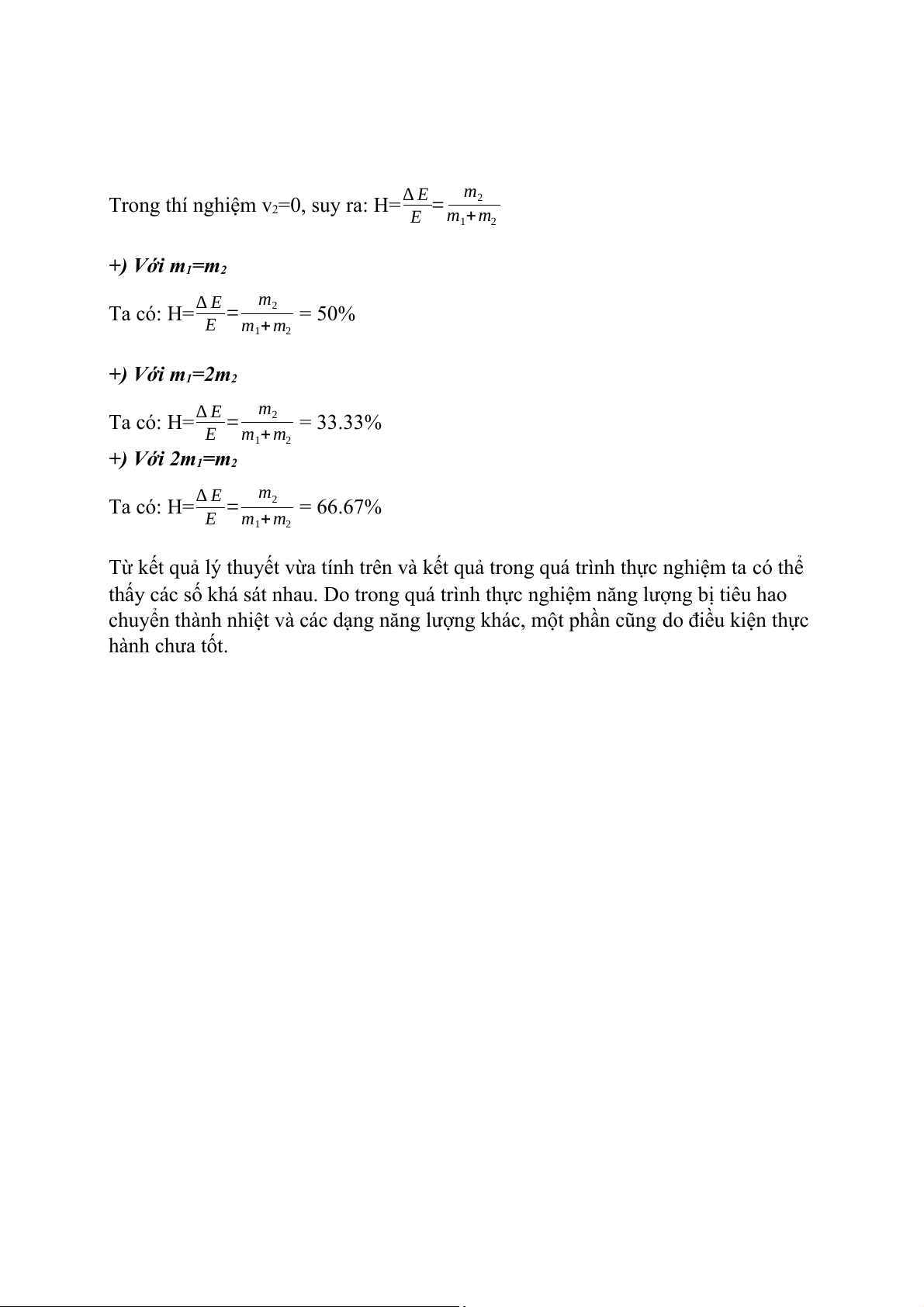 (m +m ) (m m2+m v2) 1 2 1 1 2 2 m Trong thí nghiệm v ∆ E 2 2=0, suy ra: H= = E m + m 1 2 +) Với m1=m2 m Ta có: H=∆ E = 2 = 50% E m + m 1 2 +) Với m1=2m2 m Ta có: H=∆ E = 2 = 33.33% E m + m 1 2 +) Với 2m1=m2 m Ta có: H=∆ E = 2 = 66.67% E m + m 1 2