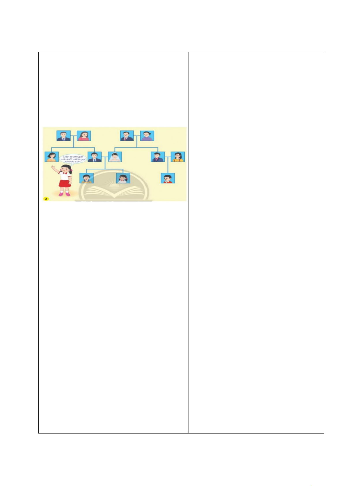 + Trong hình có những ai? + Những người nào thuộc họ nội của An? Những người nào thuộc họ ngoại của An? - GV NX, tuyên dương. *Kết luận: Ông bà sinh ra bố và các anh, chị, em của bố cùng với các con của họ là những người thuộc họ nội. Ông bà sinh ra mẹ, các anh, chị, em của mẹ cùng với các con của họ là những người thuộc họ ngoại. Hoạt động 2: Xưng hô với các thành viên trong gia đình. * Mục tiêu: HS biết cách xưng hô đúng với các thành viên trong gia đình thuộc họ nội, họ ngoại. * Cách tiến hành: - Giáo viên giao nhiệm vụ cho học sinh làm việc theo nhóm: Quan sát hình 2 trang 9 trong SGK và làm việc nhóm bốn, trả lời các câu hỏi: