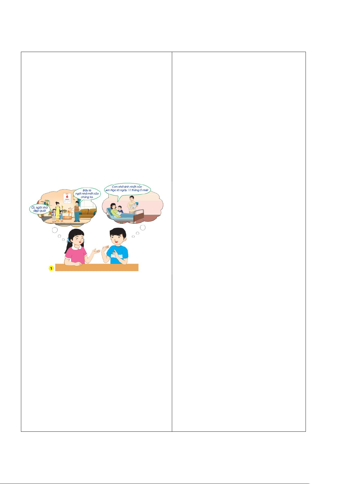 – GV mời HS trình bày ý kiến trước lớp. - GV nhẫn xét, tuyên dương. * Kết luận: Những ngày kỉ niệm của gia đình là dịp để các thành viên quây quần, bày tỏ tình cảm và gắn kết với nhau. Hoạt động 3: Liên hệ bản thân * Mục tiêu: HS nêu được tên một số ngày kỉ niệm hay sự kiện quan trọng của gia đình. * Cách tiến hành: - HS làm việc cặp đôi, chia sẻ: + Ngày sinh nhật của một số thành viên trong gia đình em. + Những việc gia đình em thường làm trong ngày đó. - GV mời 2 đến 3 cặp HS chia sẻ trước lớp. - GV và HS cùng nhận xét và đưa ra kết luận. - GV NX, tuyên dương. 🡺 Kết luận: Mỗi gia đình đều có những ngày kỉ niệm riêng. Đó là những sự kiện có ý nghĩa quan trọng và khó quên đối với tất cả các thành viên trong gia đình. 3. Hoạt động tiếp nối sau bài học * Mục tiêu: + Củng cố những kiến thức đã học trong tiết học để học sinh khắc sâu nội dung. + Vận dụng kiến thức đã học vào thực tiễn. + Tạo không khí vui vẻ, hào hứng, lưu luyến sau khi học sinh bài học. * Cách tiến hành: - GV yêu cầu HS về nhà chia sẻ với người thân trong gia đình về các ngày kỉ niệm, sự kiện quan trọng; thu thập thông tin, tranh ảnh các ngày kỉ niệm, sự kiện đó để chuẩn bị cho tiết 2. | - HS tham gia hát. - HS lắng nghe. - Lắng nghe – Mở SGK - Học sinh quan sát, thảo luận nhóm đôi và trả lời câu hỏi + An đang kể về sự kiện gia đình bạn An chuyển sang ngôi nhà mới, còn Hùng kể về sinh nhật của em gái mình. + Sự kiện của gia đình bạn An diễn ra vào ngày 6 tháng 3 năm 2021, còn sự kiện của gia đình bạn Hùng diễn ra vào ngày 11 tháng 5. - Cả lớp lắng nghe. - Học sinh quan sát và suy nghĩ. - HS chia sẻ trước lớp. Gia đình bạn An đang chúc mừng sinh nhật mẹ. Ba, chị Hà và An đã chuẩn bị một bàn tiệc trang trí rất đẹp. Ba tặng mẹ một món quà. Chị Hà và An tặng hoa cho mẹ. Mẹ chắp tay cầu nguyện. Cả gia đình An rạng ngời hạnh phúc, yêu thương nhau. - HS lắng nghe. -Thảo luận nhóm đôi - HS chia sẻ. - HS lắng nghe. - HS lắng nghe và thực hiện. |