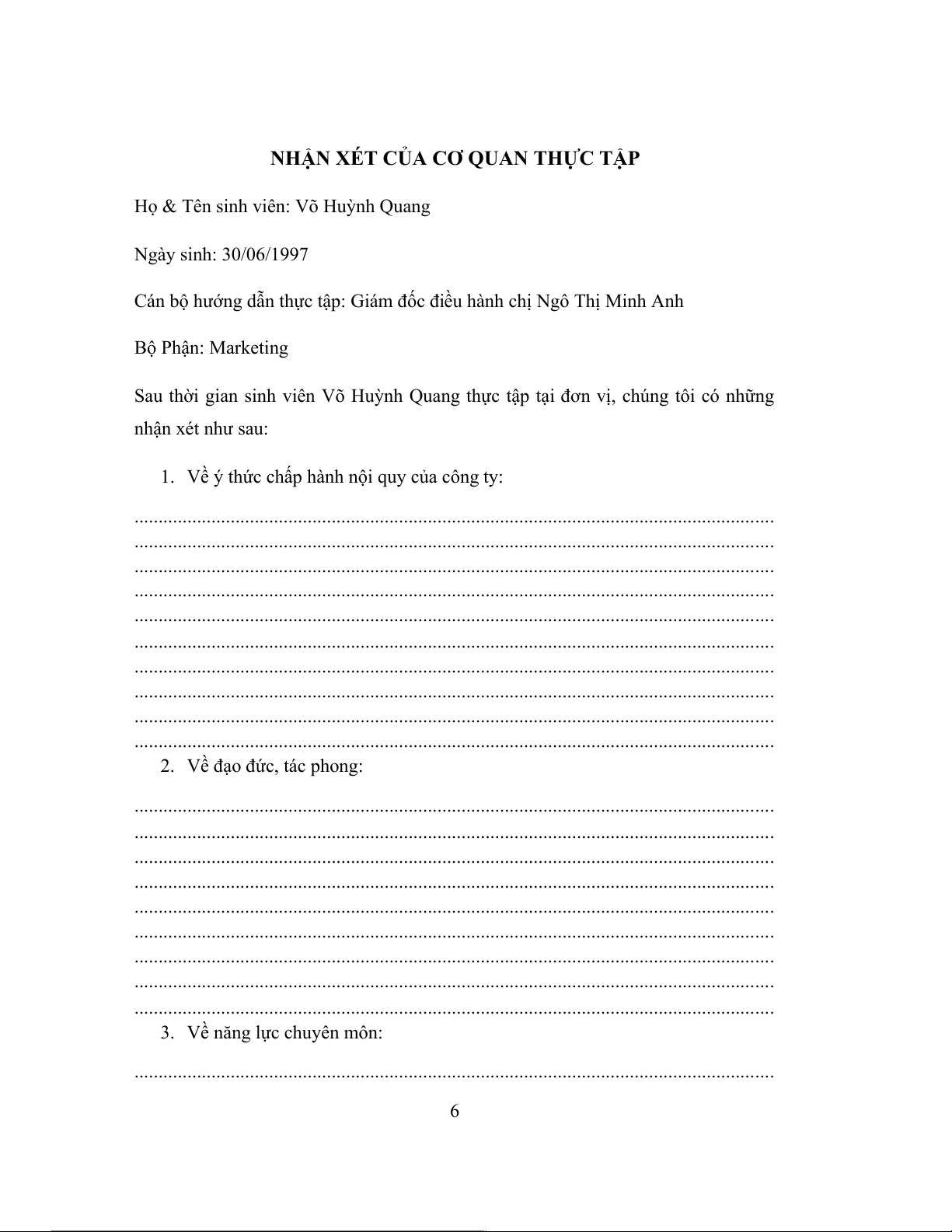 Sau thời gian sinh viên Võ Huỳnh Quang thực tập tại đơn vị, chúng tôi có những nhận xét như sau: