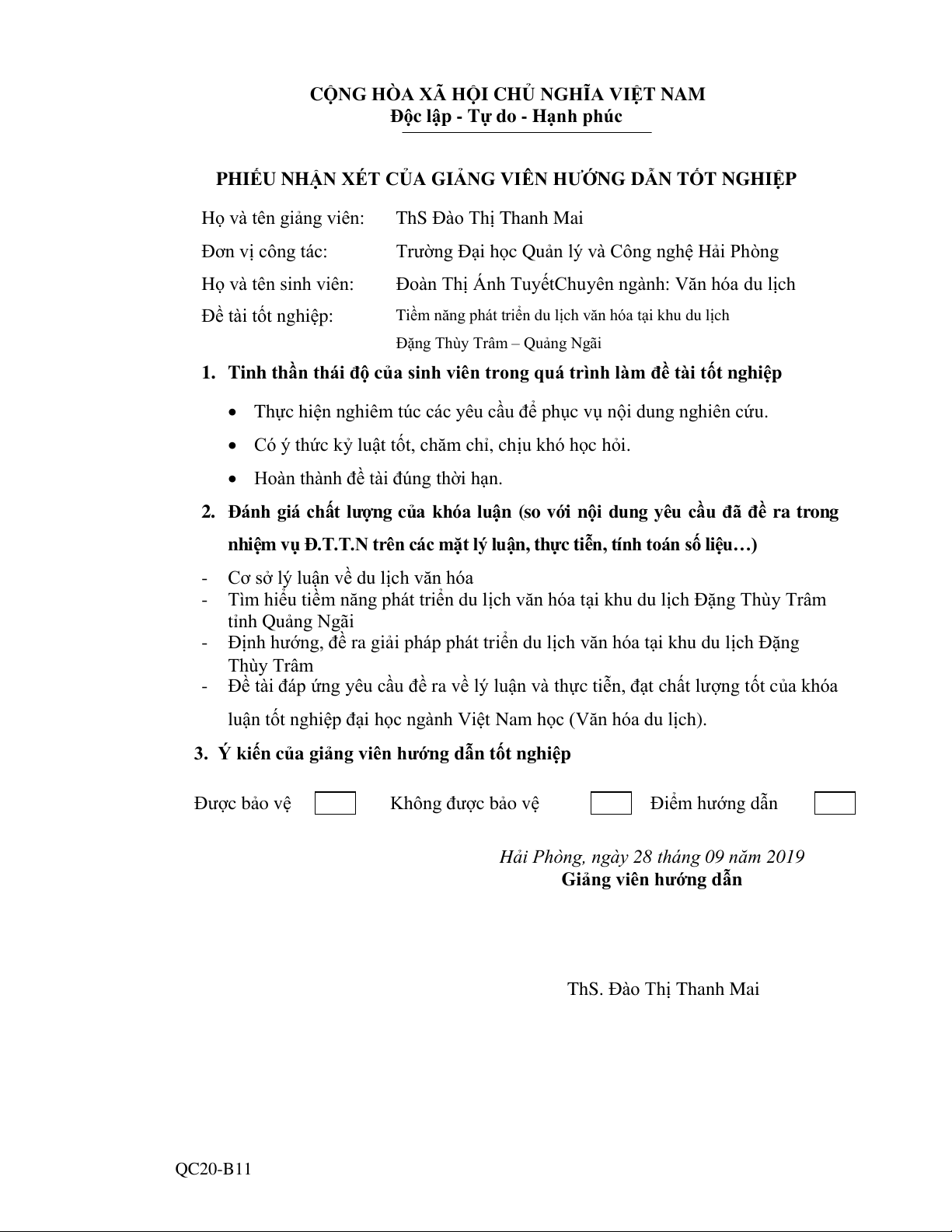 PHIẾU NHẬN XÉT CỦA GIẢNG VIÊN HƯỚNG DẪN TỐT NGHIỆP Họ và tên giảng viên: ThS Đào Thị Thanh Mai Đơn vị công tác: