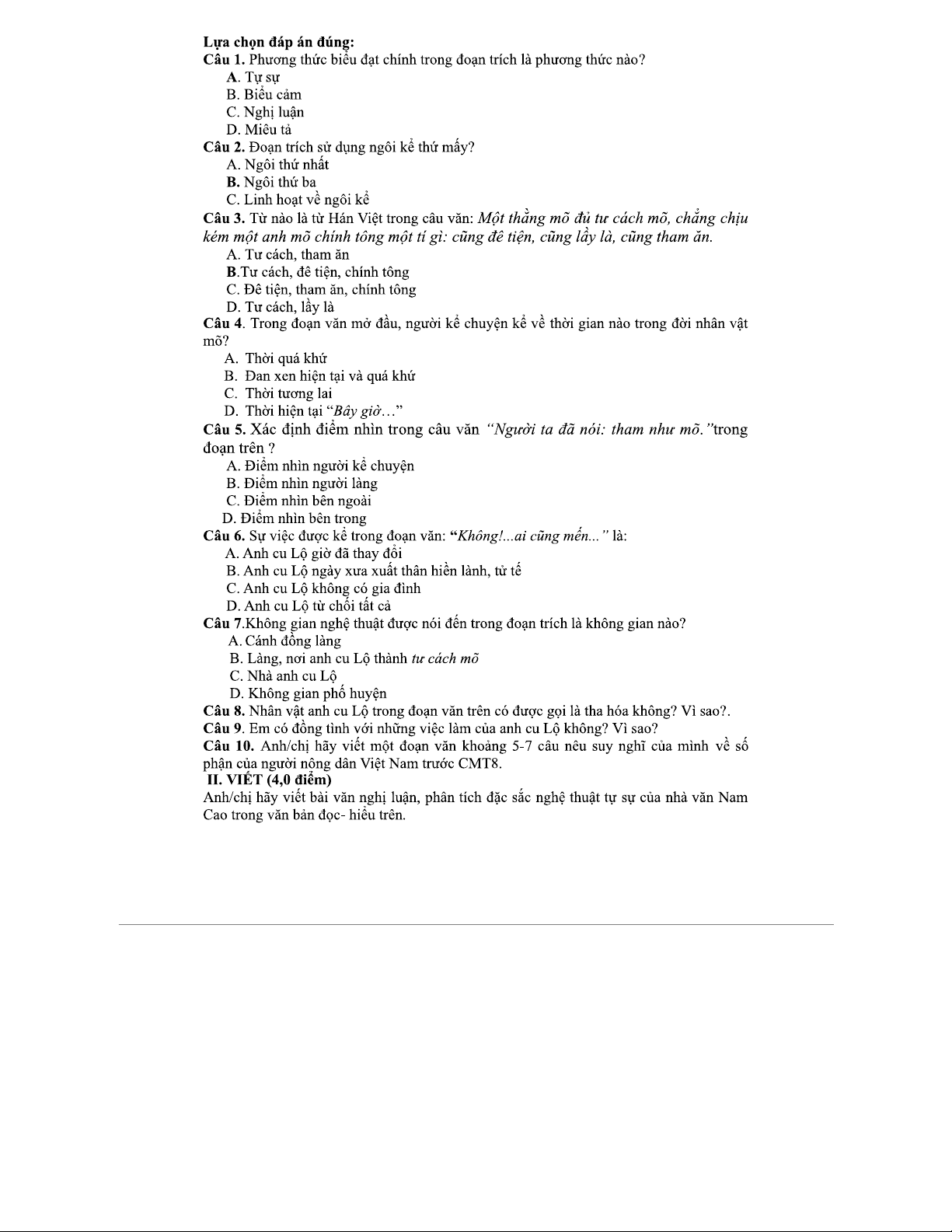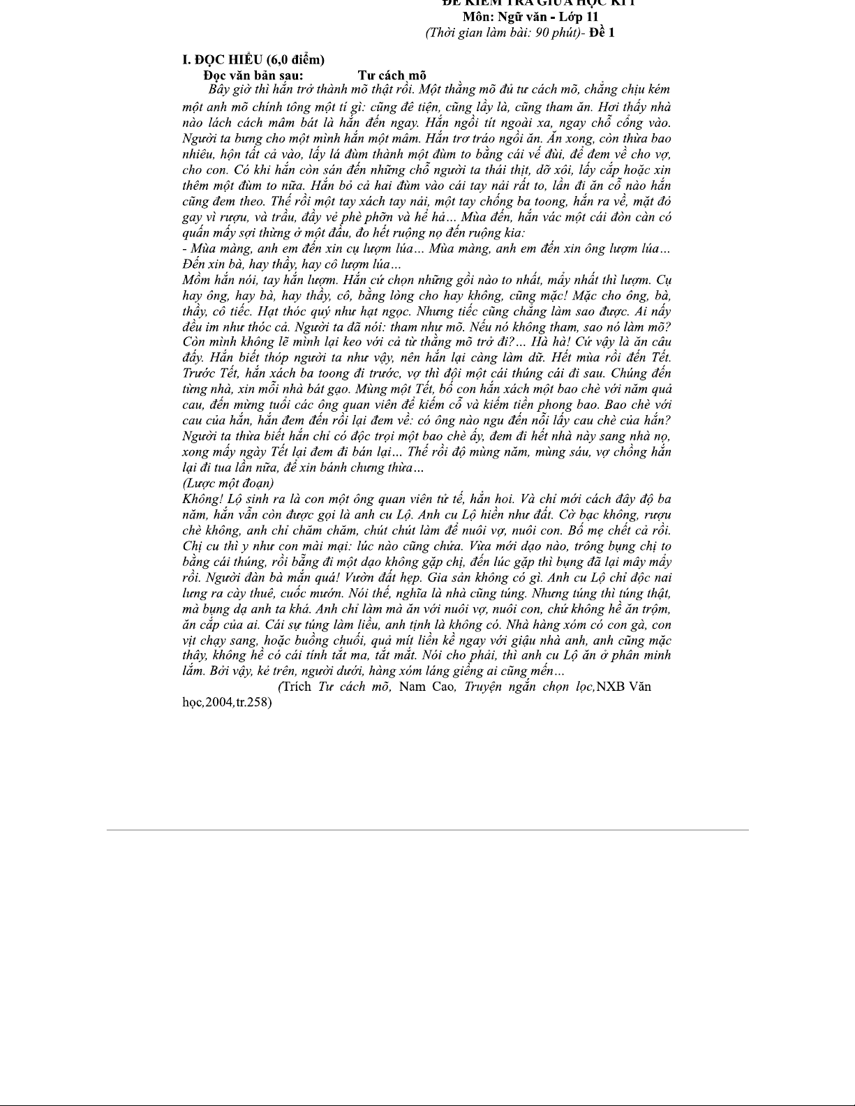 KHỐI 11 - TƯ CÁCH MÕ - Đề kiểm tra giữa học kỳ I môn Ngữ văn