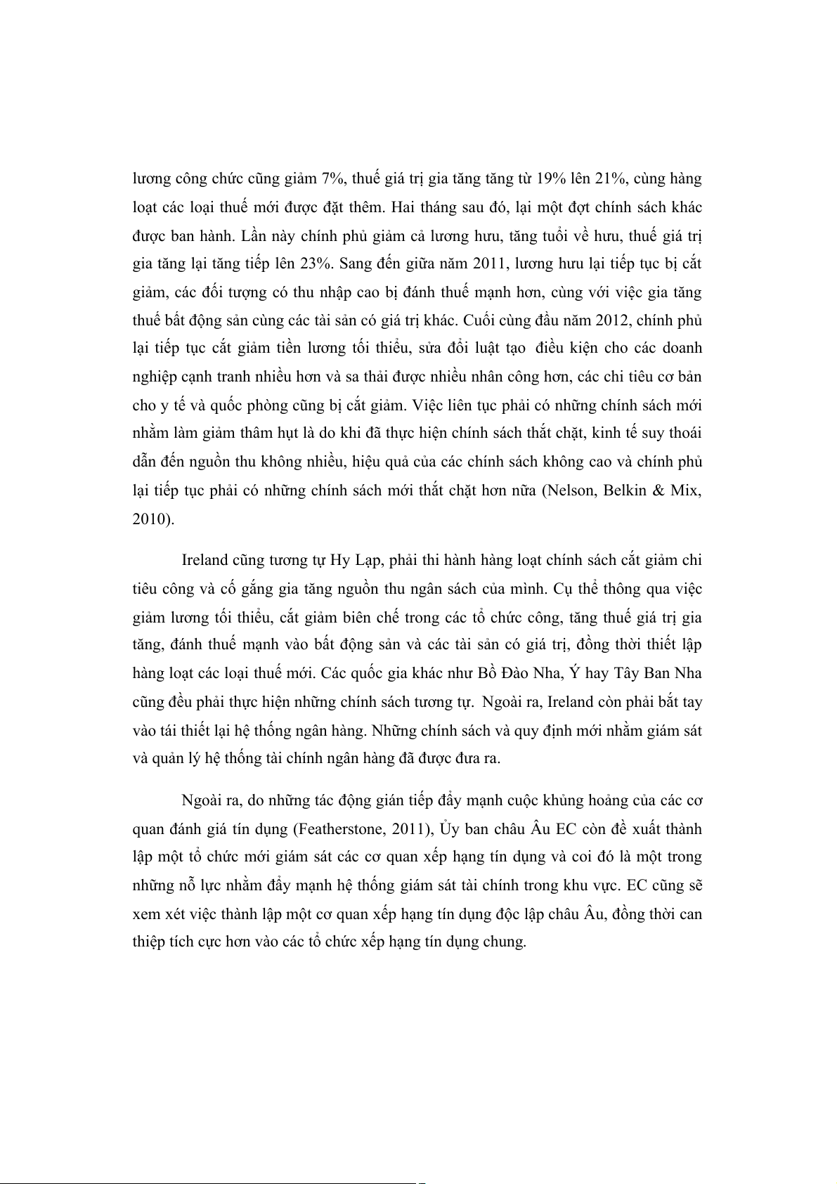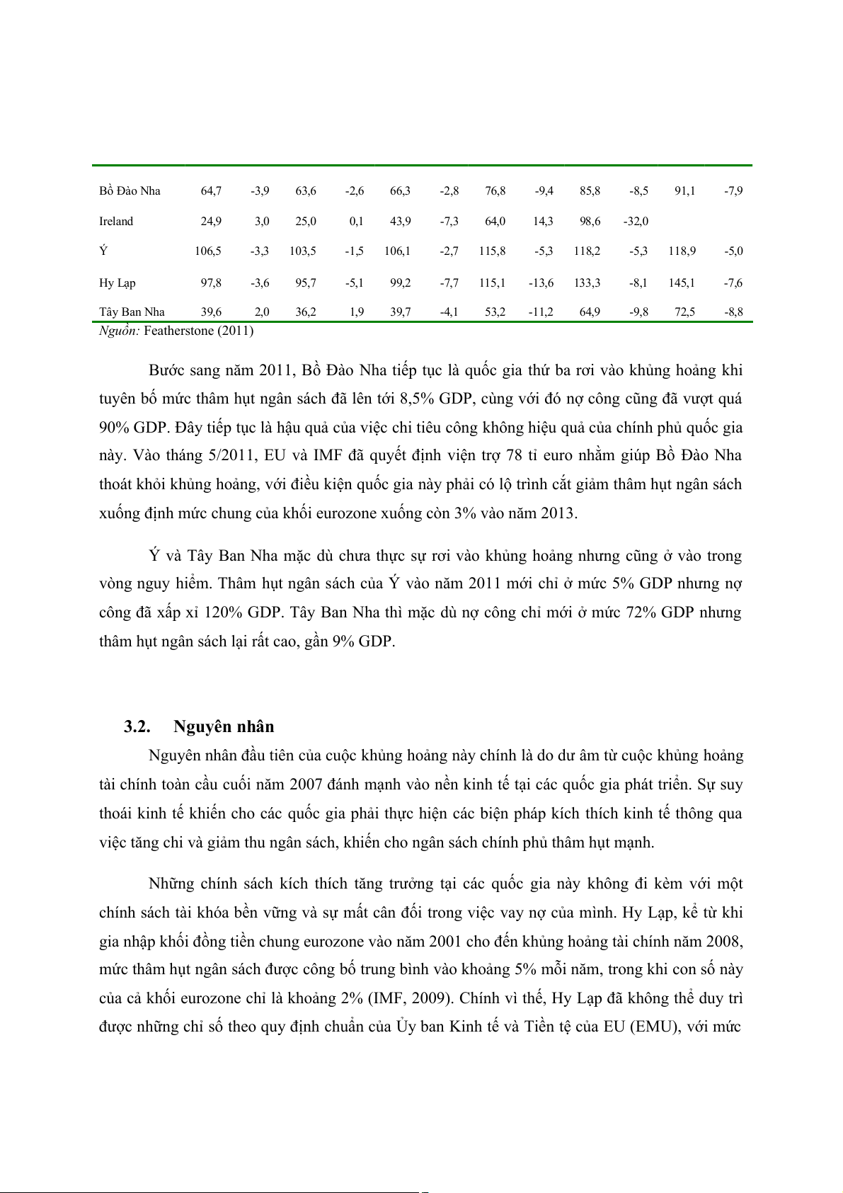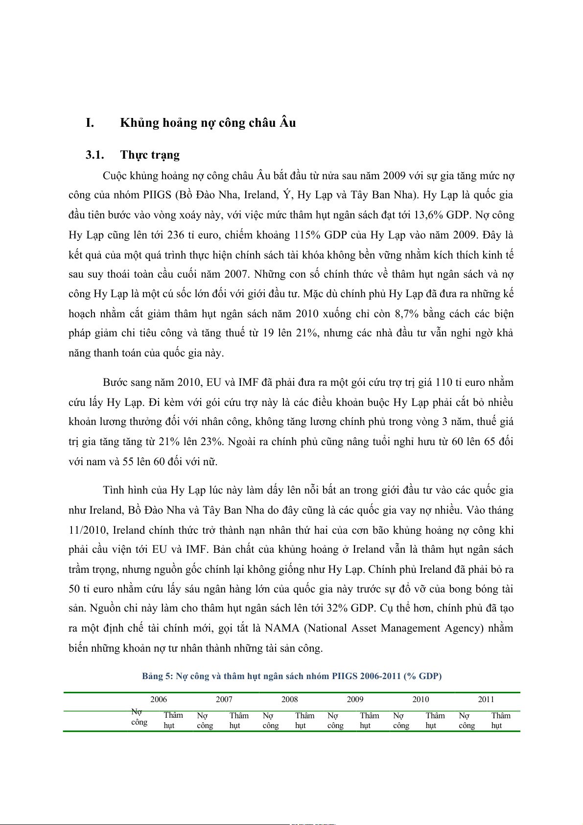 Bảng 5: Nợ công và thâm hụt ngân sách nhóm PIIGS 2006-2011 (% GDP) 2006 2007 2008 2009 2010 2011 Nợ Thâm Nợ Thâm Nợ Thâm Nợ Thâm Nợ Thâm Nợ Thâm công hụt công hụt công hụt công hụt công hụt công hụt Bồ Đào Nha 64,7 -3,9 63,6 -2,6 66,3 -2,8 76,8 -9,4 85,8 -8,5 91,1 -7,9 Ireland 24,9 3,0 25,0 0,1 43,9 -7,3 64,0 14,3 98,6 -32,0 Ý 106,5 -3,3 103,5 -1,5 106,1 -2,7 115,8 -5,3 118,2 -5,3 118,9 -5,0 Hy Lạp 97,8 -3,6 95,7 -5,1 99,2 -7,7 115,1 -13,6 133,3 -8,1 145,1 -7,6 Tây Ban Nha 39,6 2,0 36,2 1,9 39,7 -4,1 53,2 -11,2 64,9 -9,8 72,5 -8,8