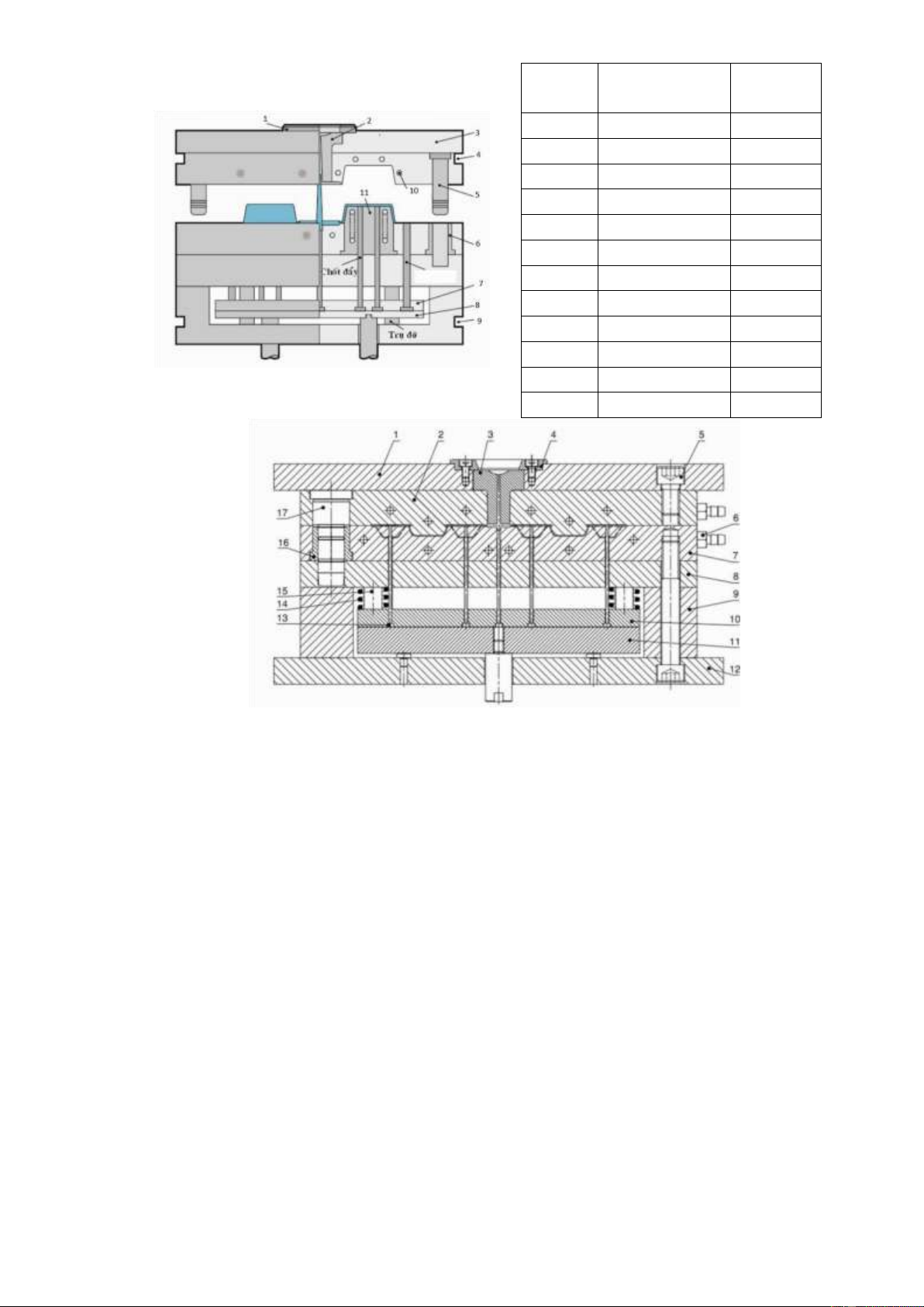 lOMoAR cPSD| 32573545 Chi Tên gọi Vật liệu 1 tiết 1 Vòng định vị S45C 2 Bạc cuốn phun SKD61 3 Tấm kẹp C50 4 Rãnh kẹp C50 5 Chốt dẫn hướng C50 6 Bạc dẫn hướng SK7 7 Tấm giữ C45 8 Tấm đẩy C45 9 Rãnh kẹp C50 10 Chốt hồi SK7 11 Kênh làm nguội 12 Khuôn đực SKD11