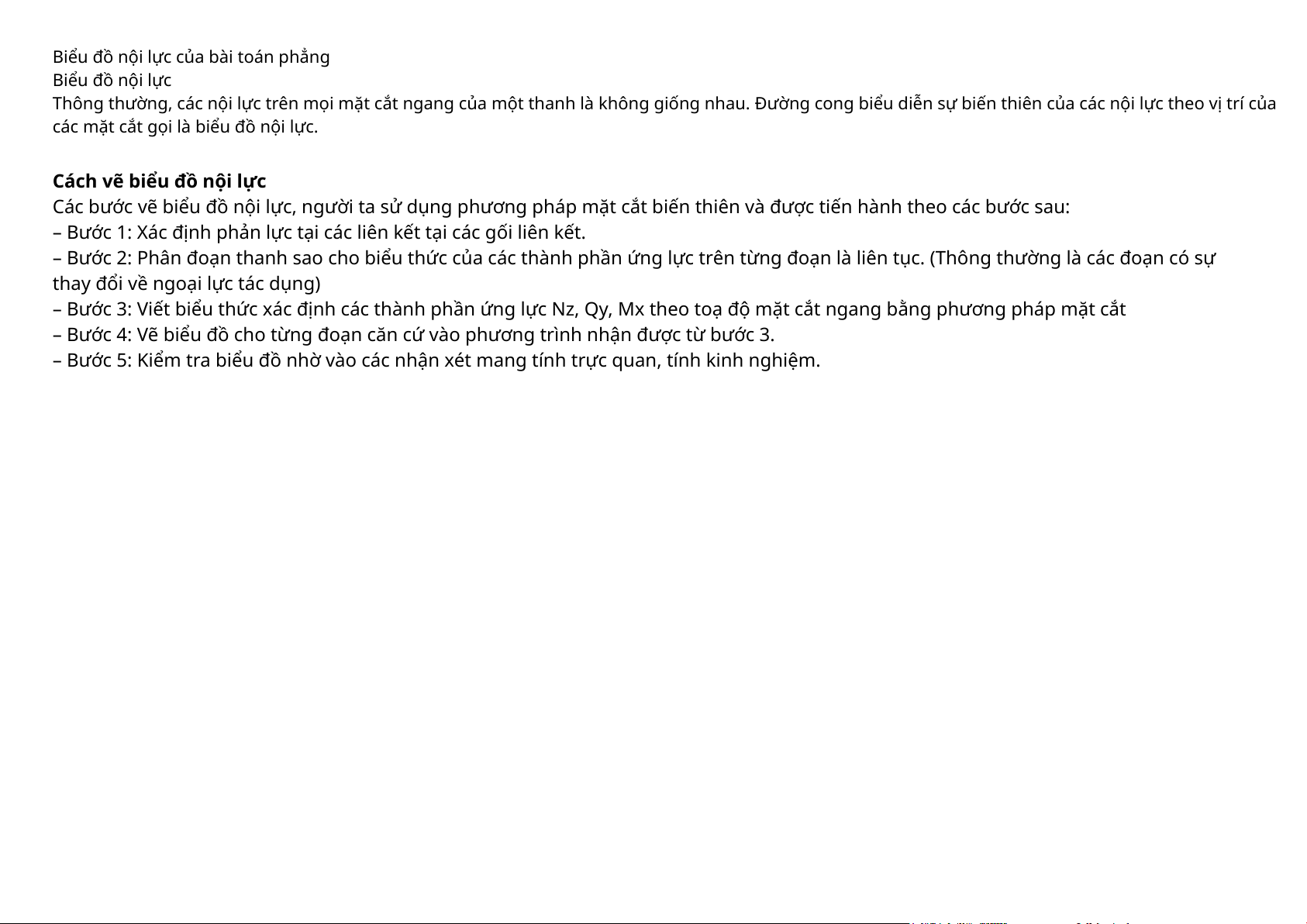 Các bước vẽ biểu đồ nội lực, người ta sử dụng phương pháp mặt cắt biến thiên và được tiến hành theo các bước sau: