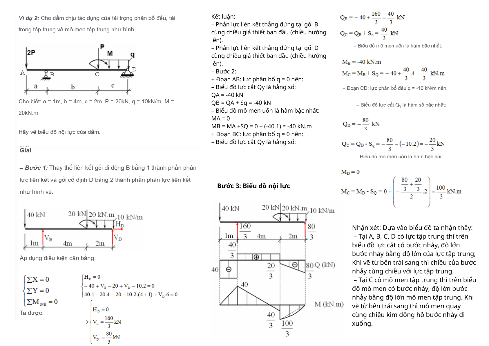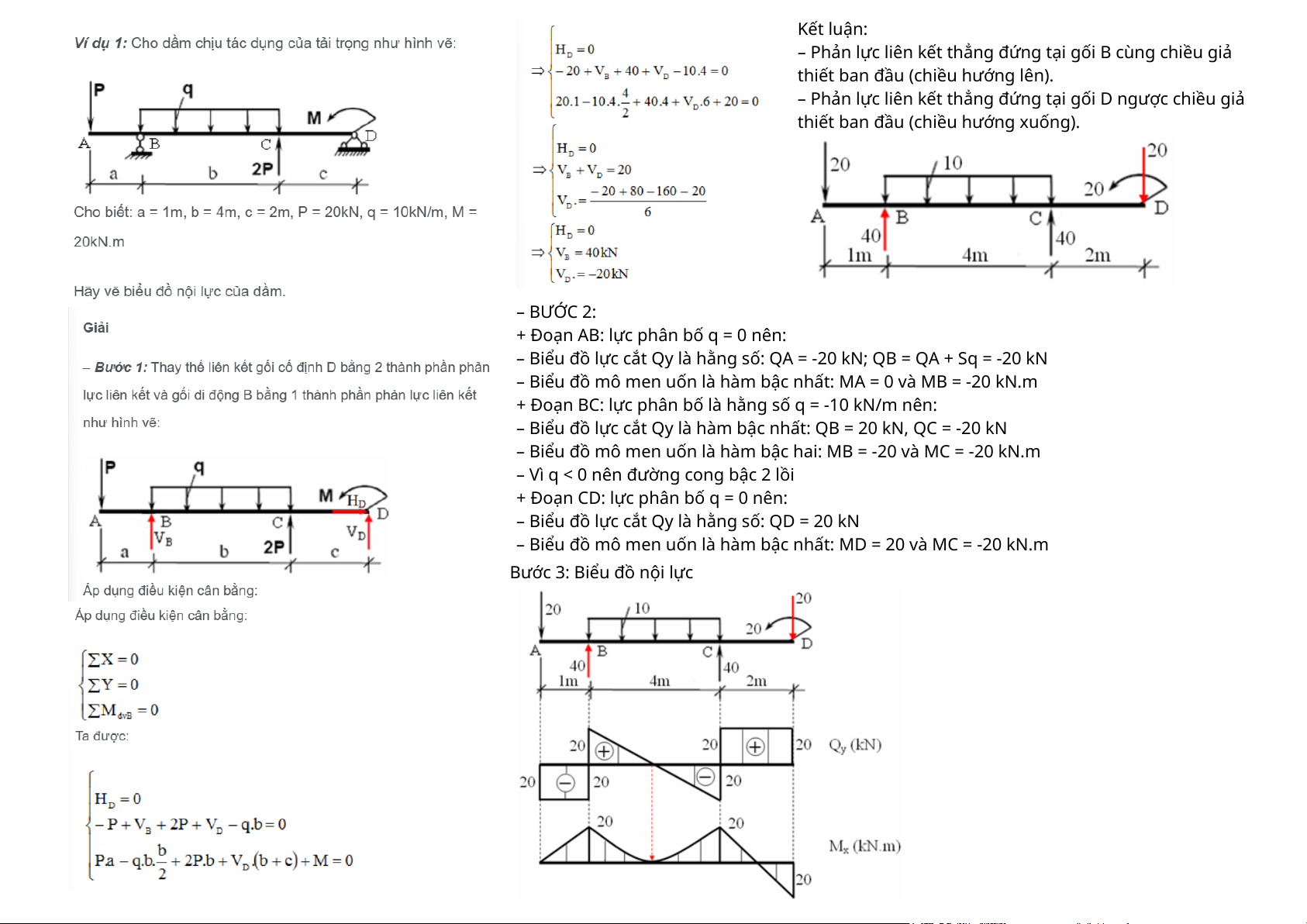 – Biểu đồ mô men uốn là hàm bậc hai: MB = -20 và MC = -20 kN.m