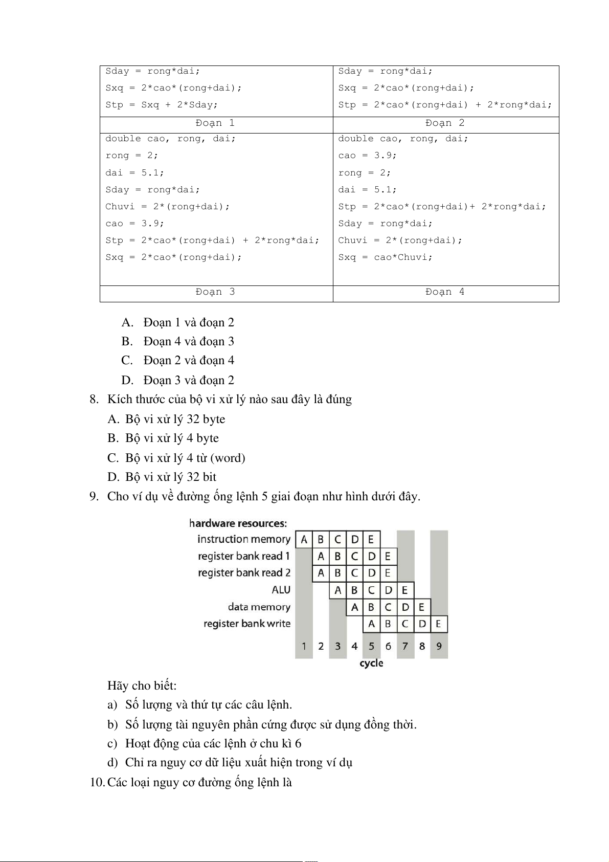8. Kích thước của bộ vi xử lý nào sau đây là đúng A. Bộ vi xử lý 32 byte B. Bộ vi xử lý 4 byte