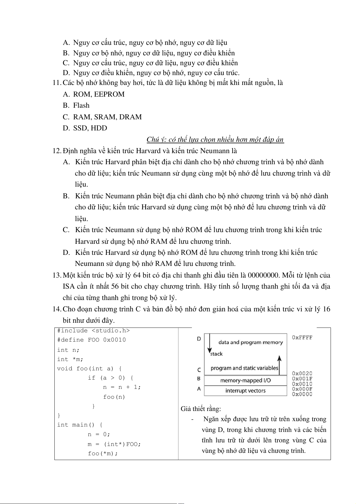 14. Cho đoạn chương trình C và bản đồ bộ nhớ đơn giản hoá của một kiến trúc vi xử lý 16 bit như dưới đây. #include #define FOO 0x0010 int n; int *m; void foo(int a) { if (a > 0) { n = n + 1; foo(n) } Giả thiết rằng: }