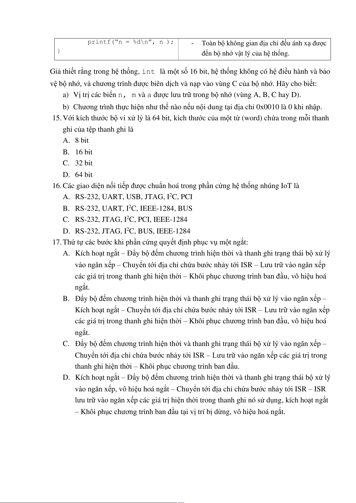 Giả thiết rằng trong hệ thống, int là một số 16 bit, hệ thống không có hệ điều hành và bảo