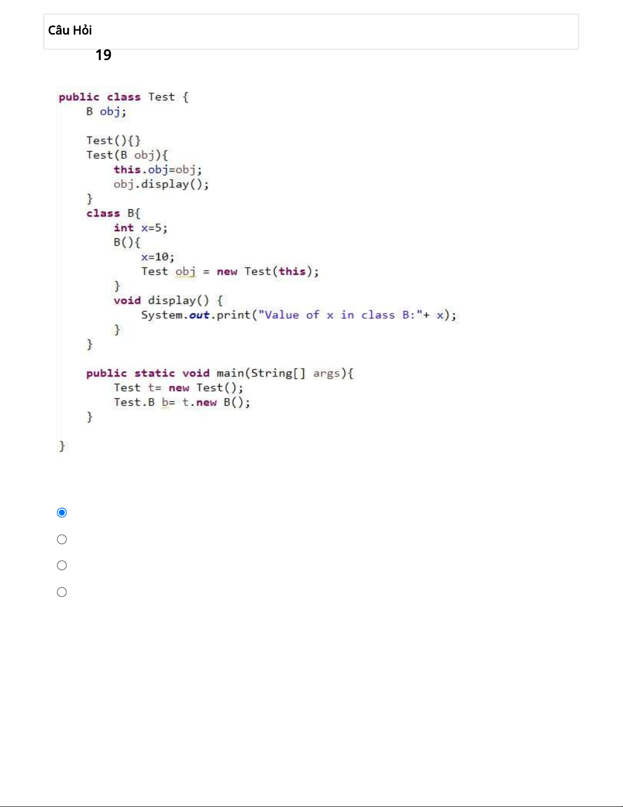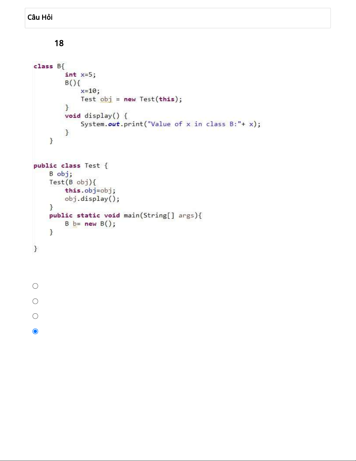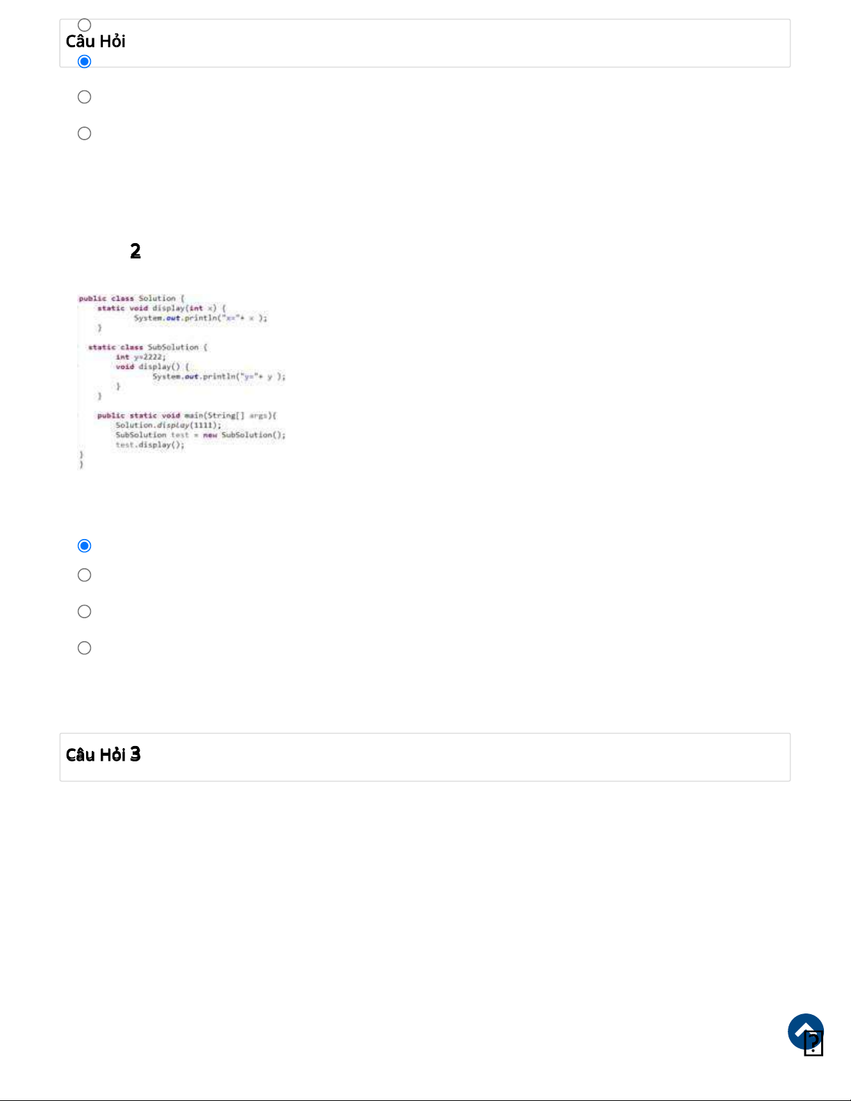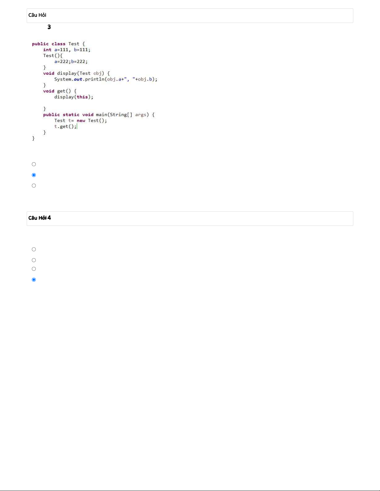 D. Lỗi chạy do lệnh tạo đối tượng b của lớp B bị sai lOMoAR cPSD| 58833082 Câu Hỏi 20 Chưa trả lời Clear my choice
