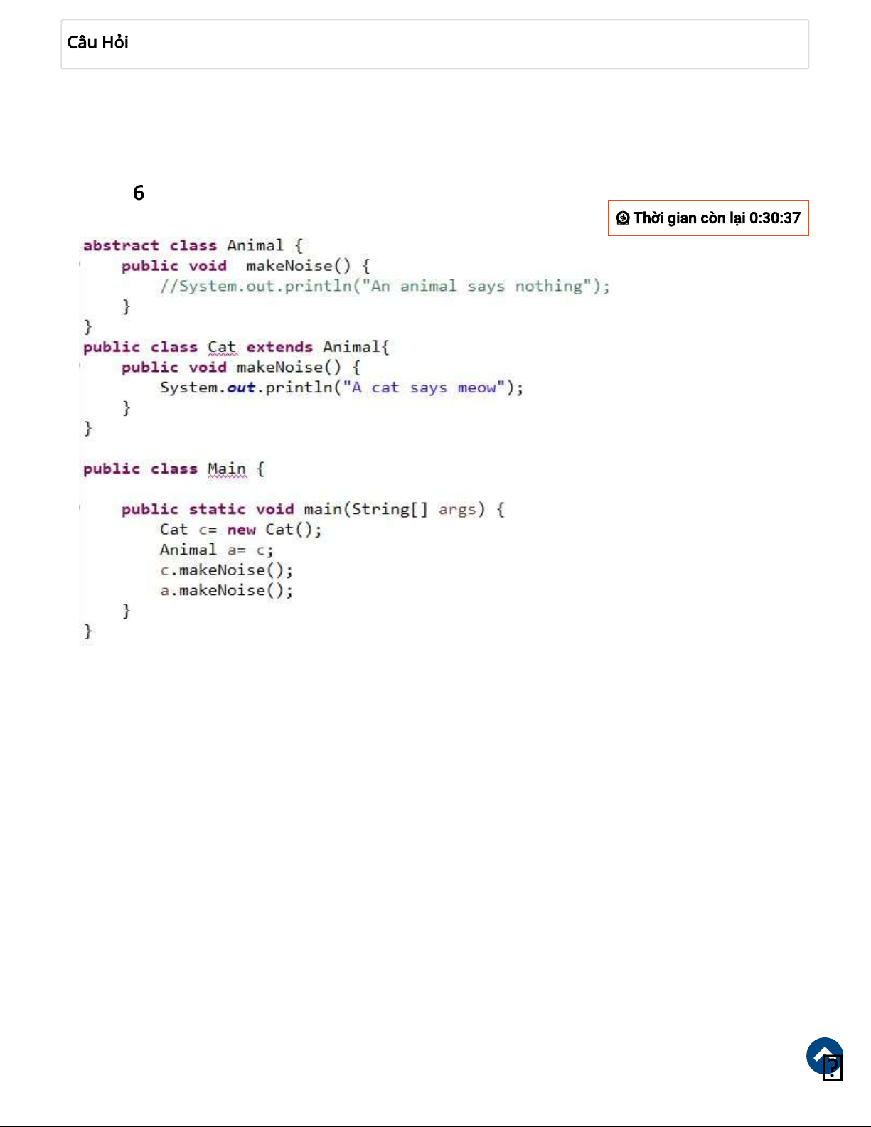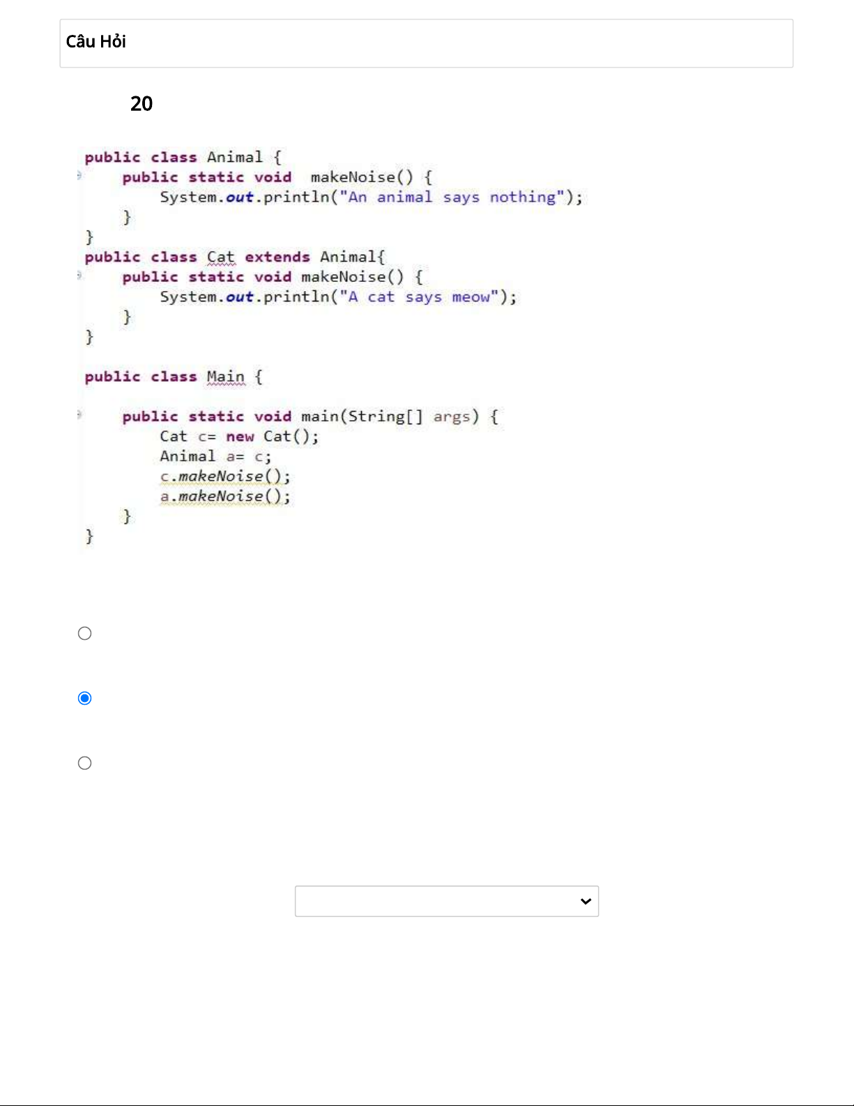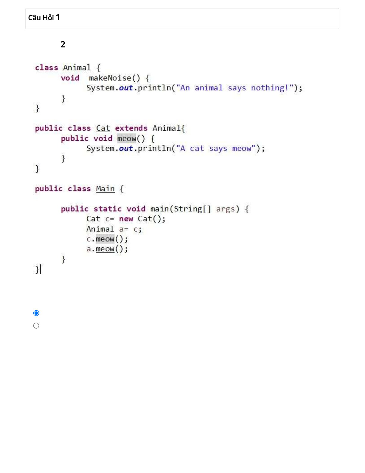 Chương trình khi chạy kết quả sẽ là: A. A cat says meow A cat says meow B. A cat says meow An animal says nothing C.