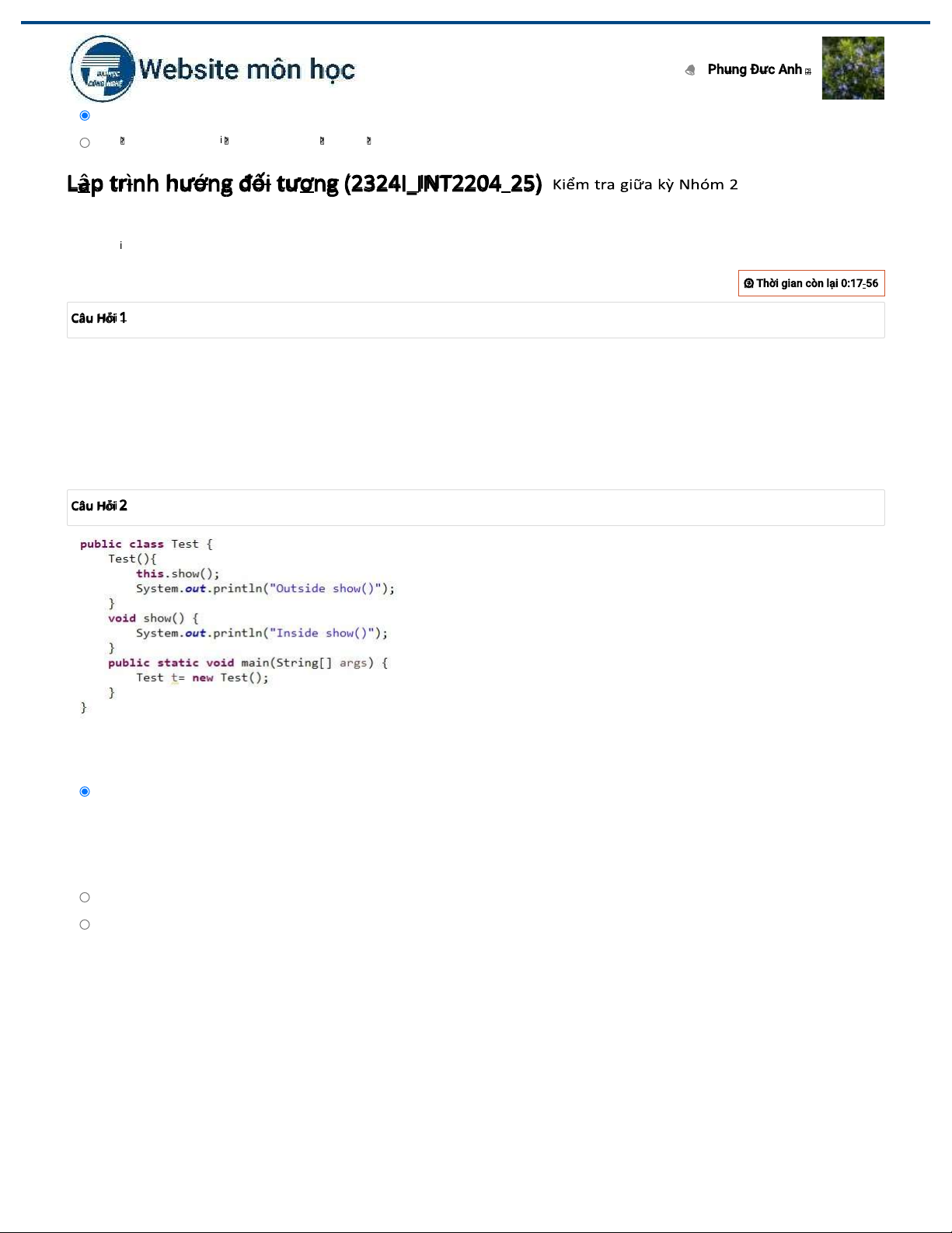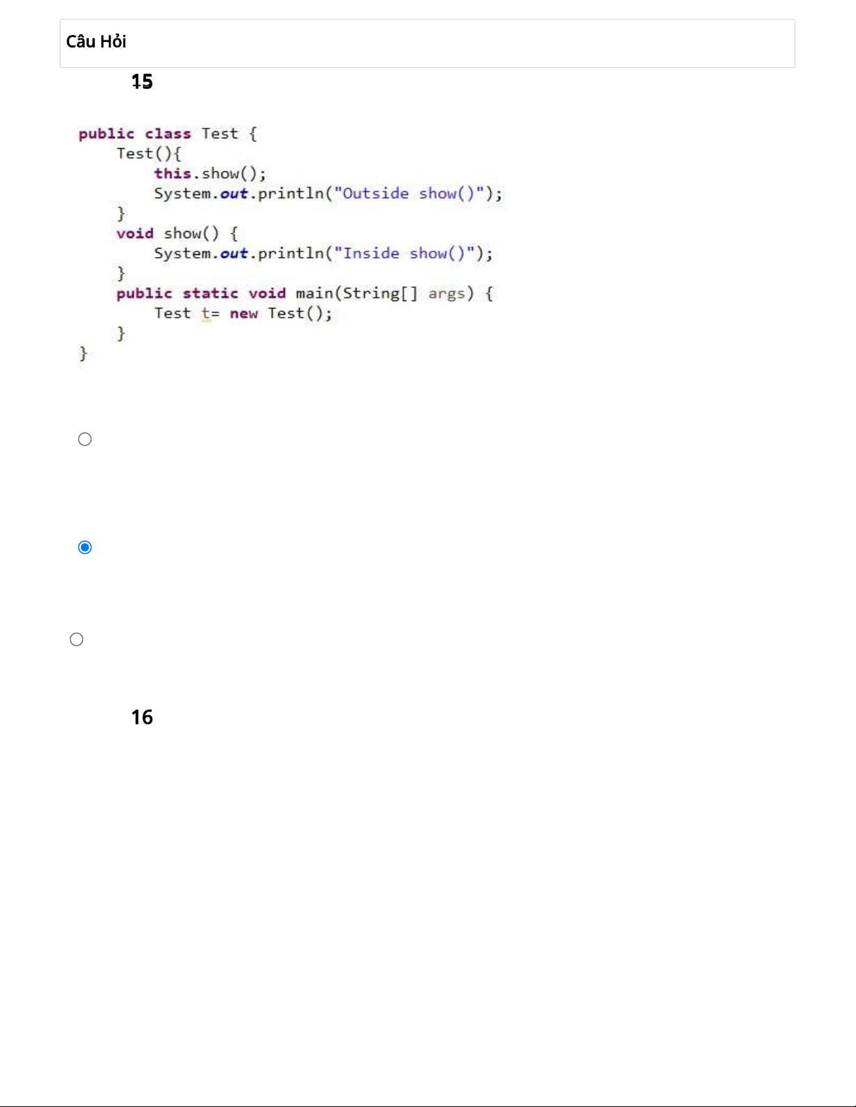 B. Chương trình lỗi không chạy được C. Outside show() Inside show() Clear my choice lOMoAR cPSD| 58833082 Câu Hỏi