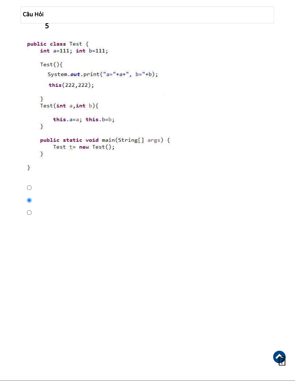 Câu trả lời đã được lưu C. a=111, b=111 Clear my choice