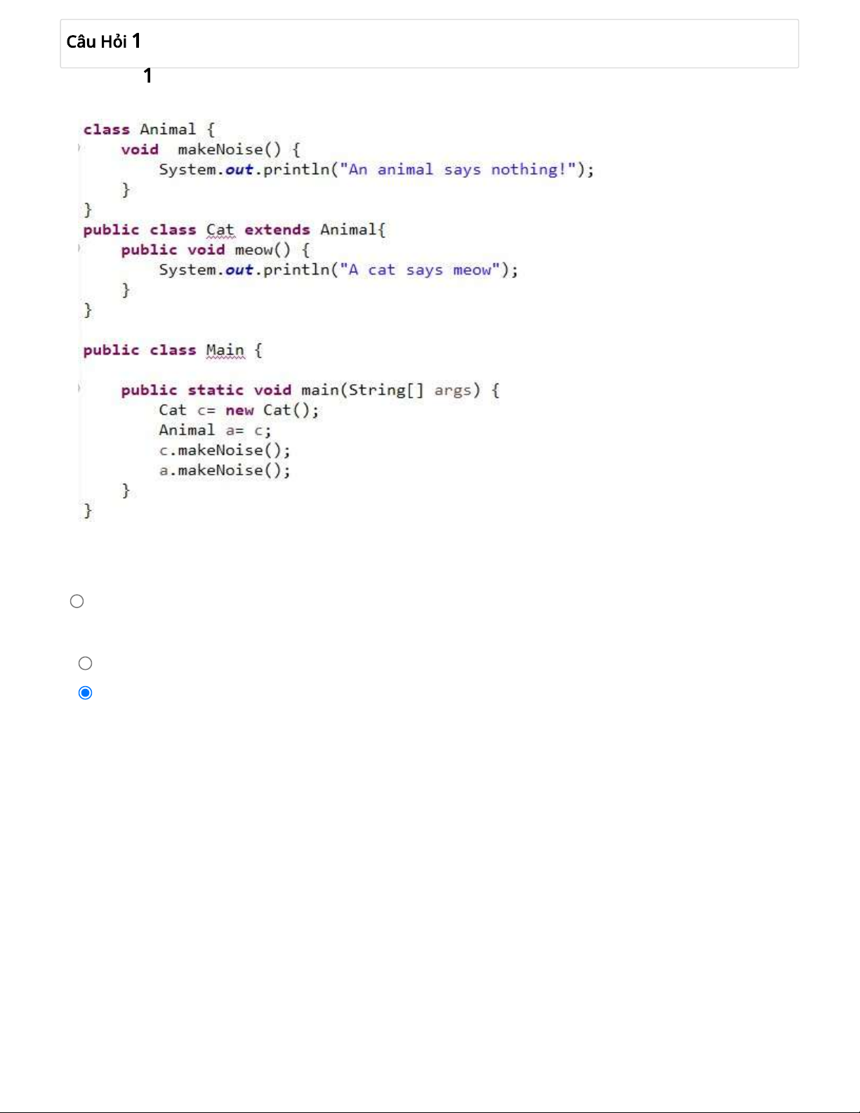 Khi chạy chương trình có kết quả là: A. A cat says meow An animal says nothing B. Chương trình có lỗi