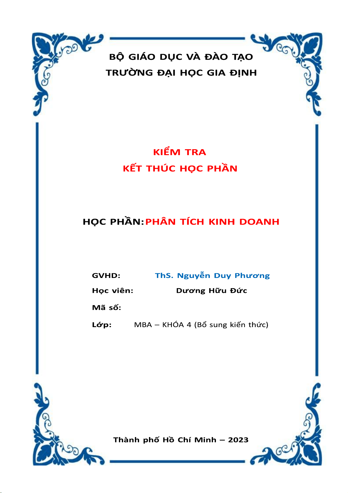 1. Học viên điền đầy đủ thông tin trang bìa và trang lót của bài kiểm tra cuối kỳ. (Học