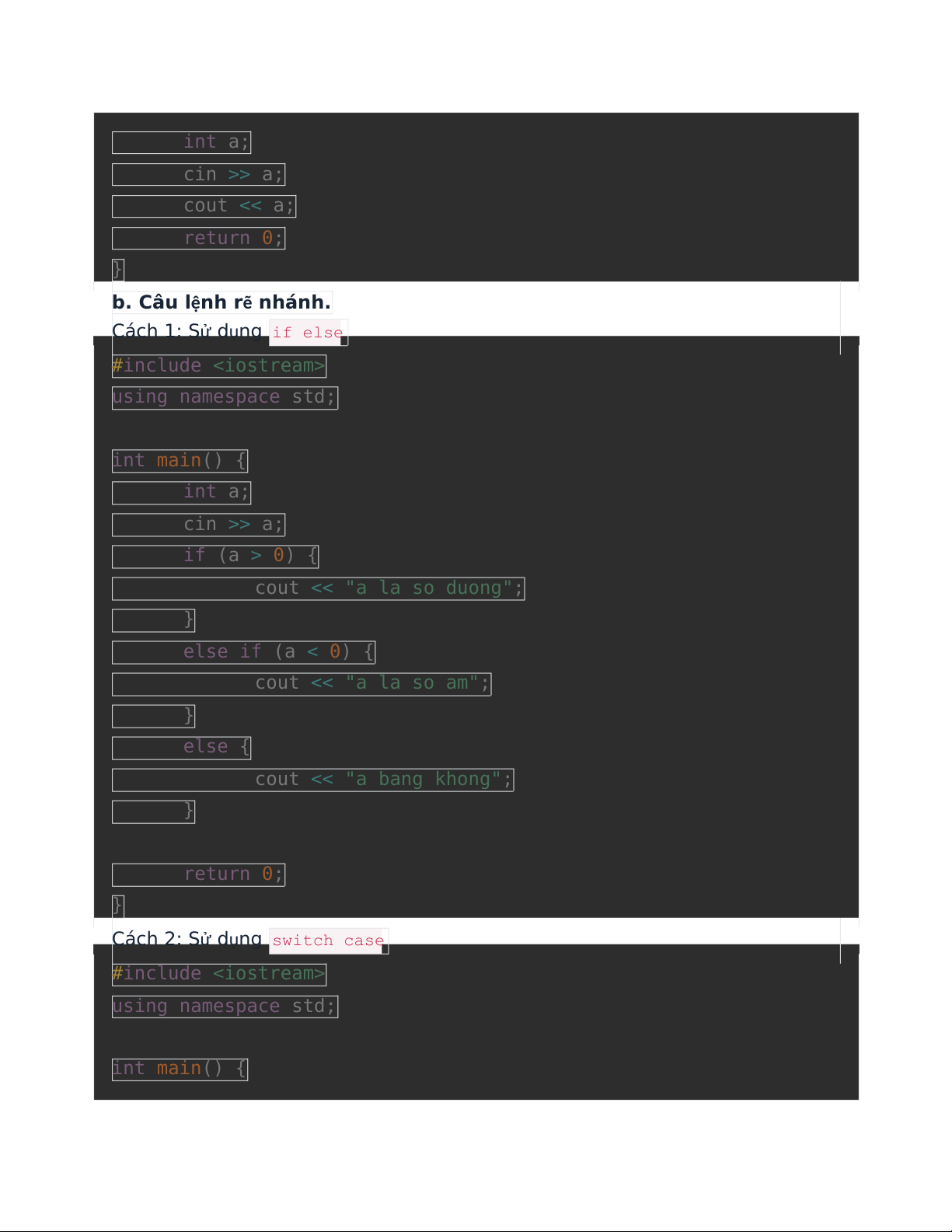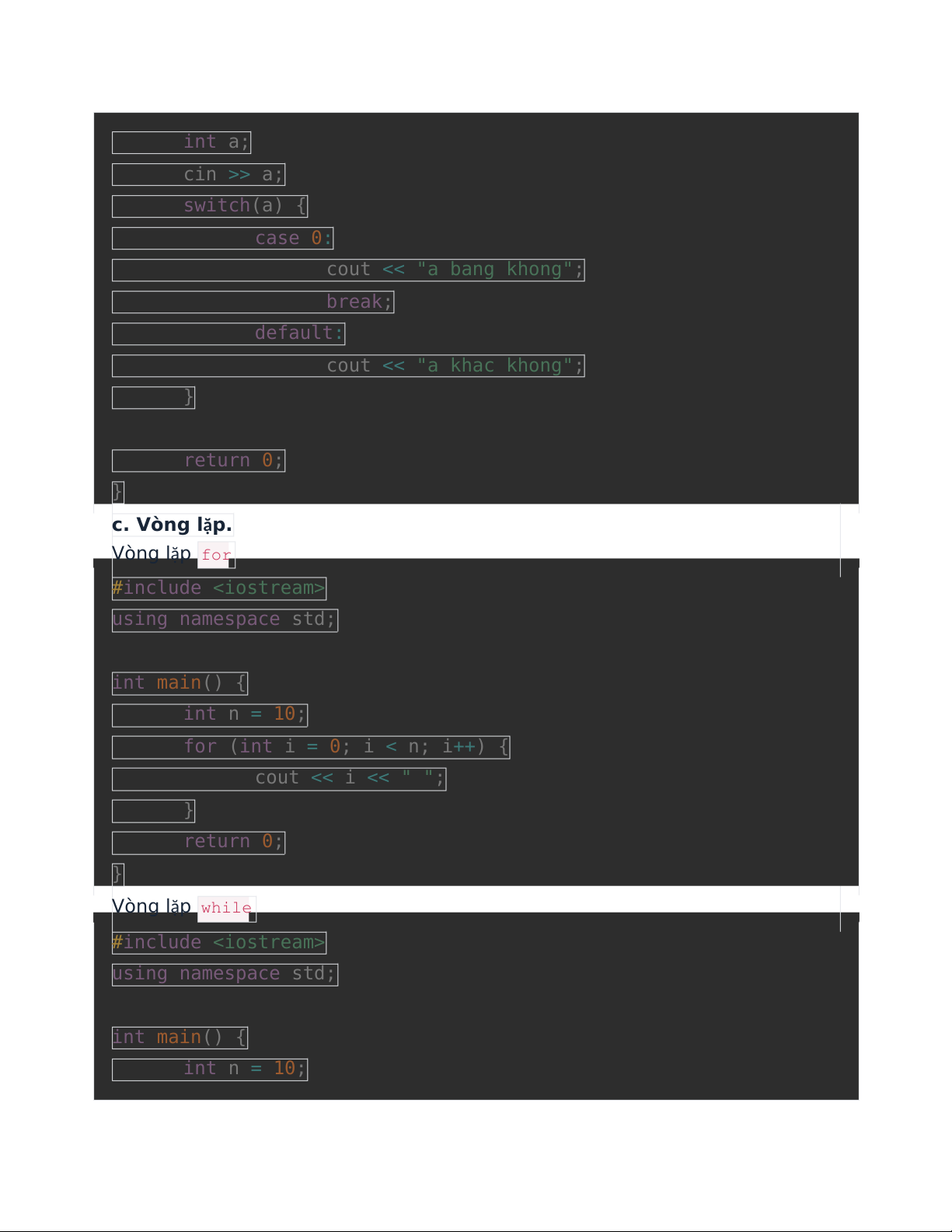 Cách 2: Sử dụng" switch case #include using namespace std; int main() { int a; cin >> a; switch(a) { case 0: cout << "a bang khong"; break; default: cout << "a khac khong"; } return 0; } c. Vòng lặp. Vòng lặp" for #include using namespace std; int main() { int n = 10;