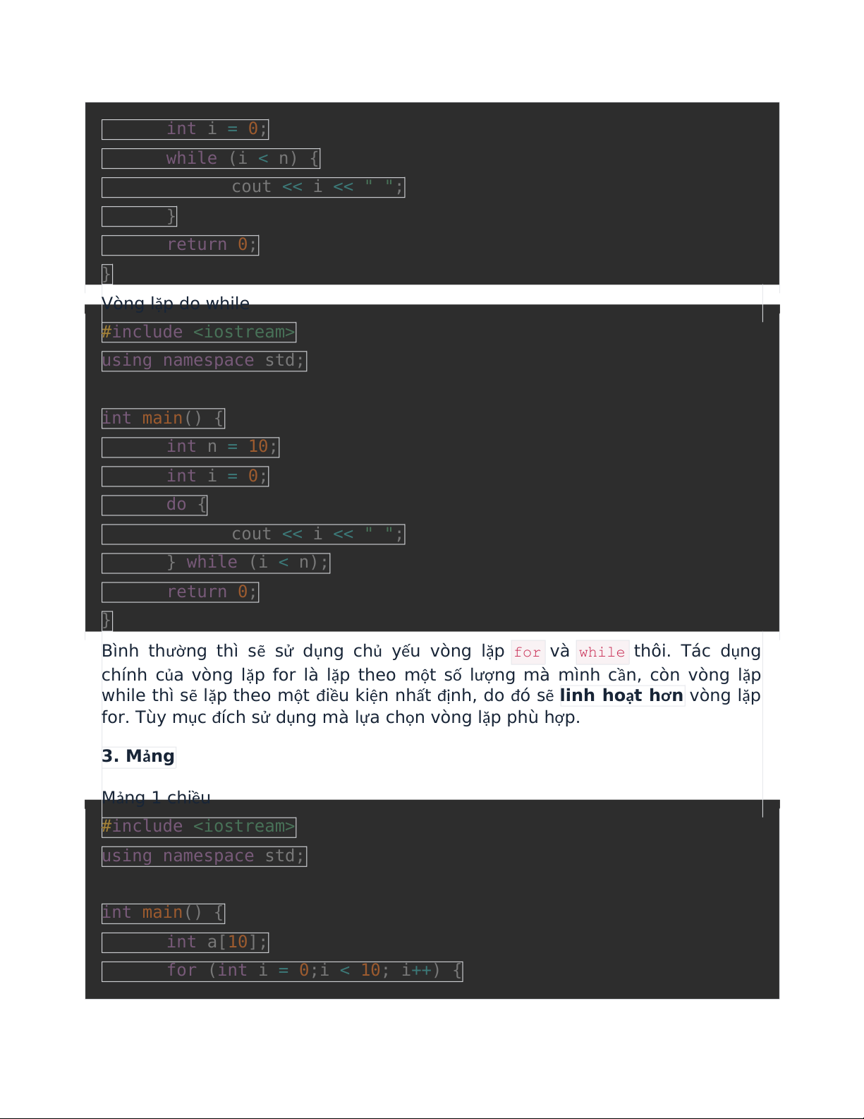 for. Tùy mục đích sử dụng mà lựa chọn vòng lặp phù hợp. 3. Mảng Mảng 1 chi u ề #include using namespace std; int main() { int a[10];