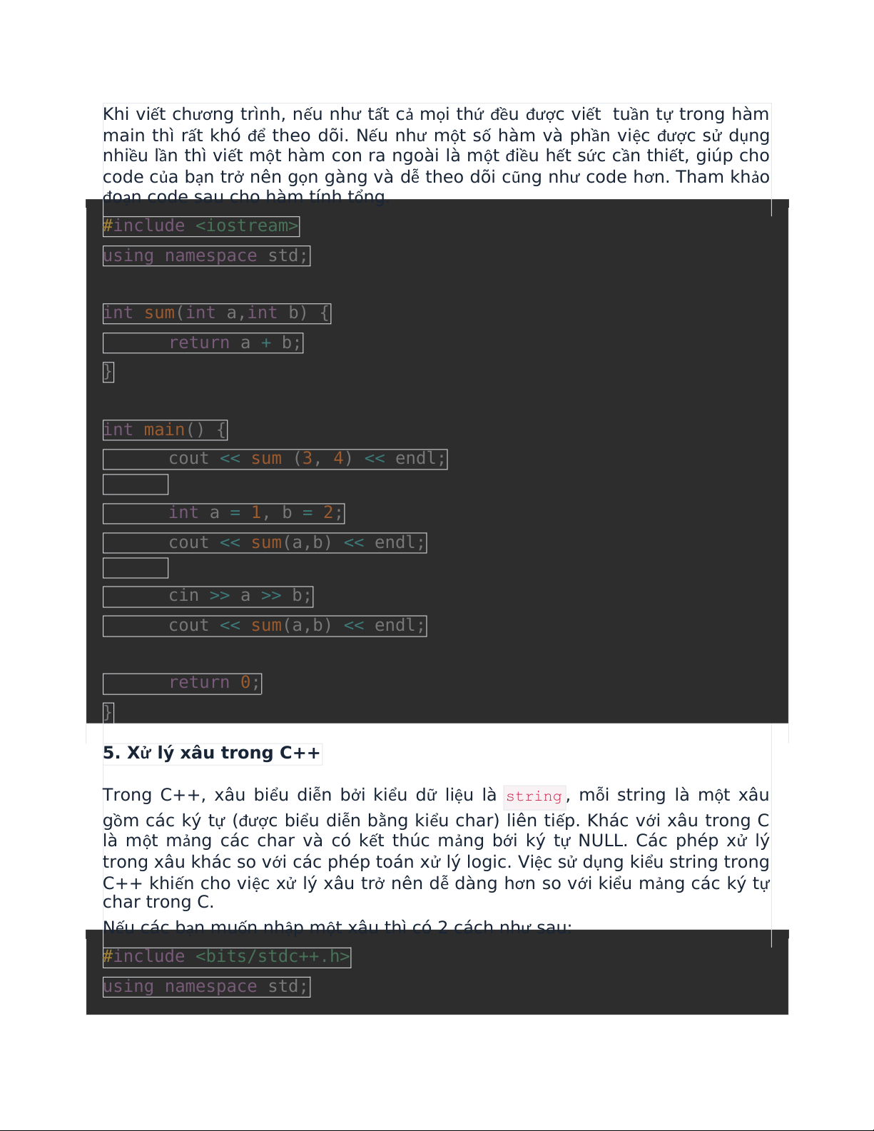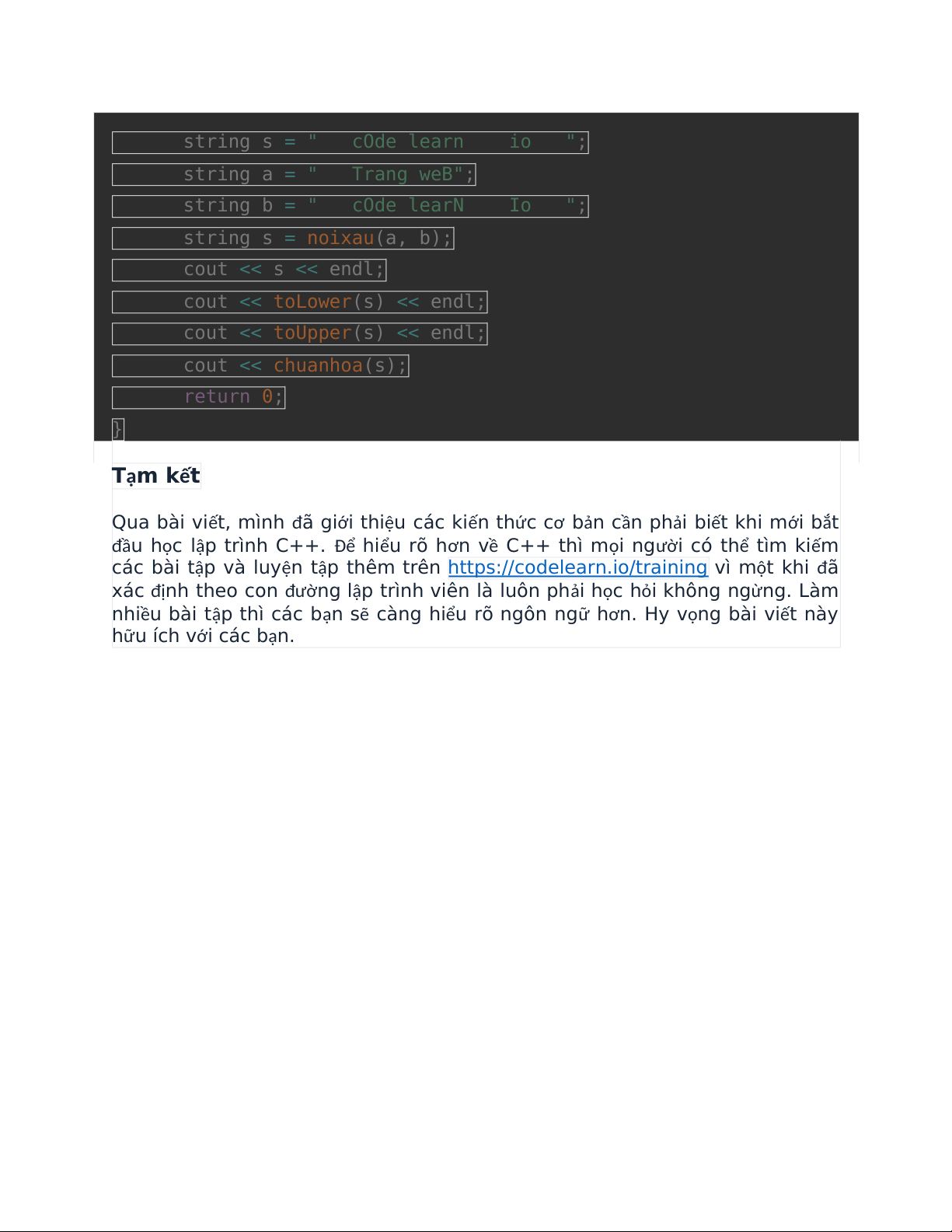 if (a[i] >= 'a' && a[i] <= 'z') a[i] += 'A'-'a'; res += a[i]; } } return res; } int main() { string s = " cOde learn io "; string a = ; " Trang weB" string b = " cOde learN Io "; string s = (a, b); noixau cout << s << endl; cout << toLower(s) endl; << cout << toUpper(s) endl; << cout << chuanhoa(s); return 0; } Tạm kết Qua bài vi t, ế mình đã gi i