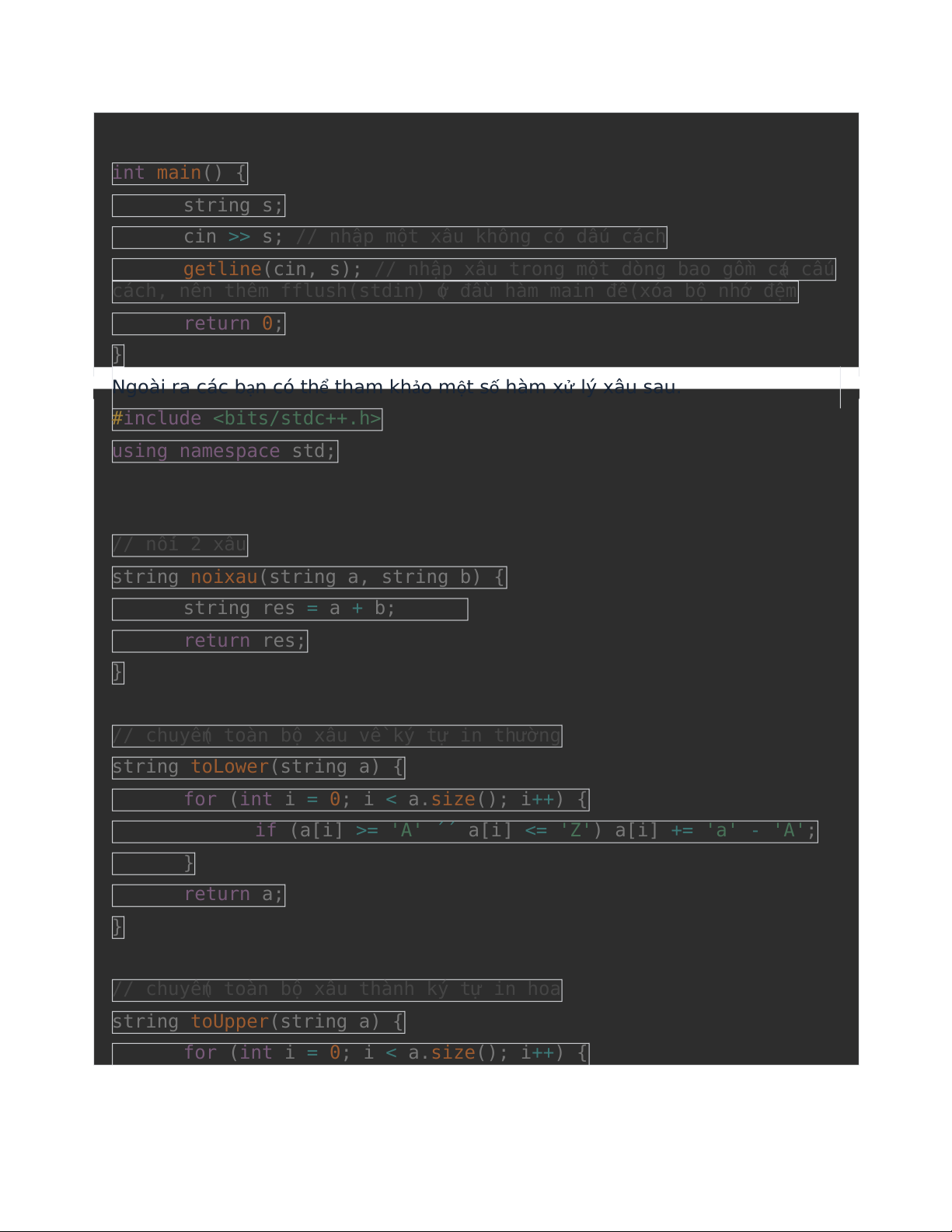Ngoài ra các bạn có thể tham khảo một số hàm xử lý xâu sau. #include using namespace std; // nô& i 2 xâu string (string a, string b) { noixau string res = a + b; return res; } // chuyế( n toàn bộ xâu vếD ký tự in thường string toLower(string a) {