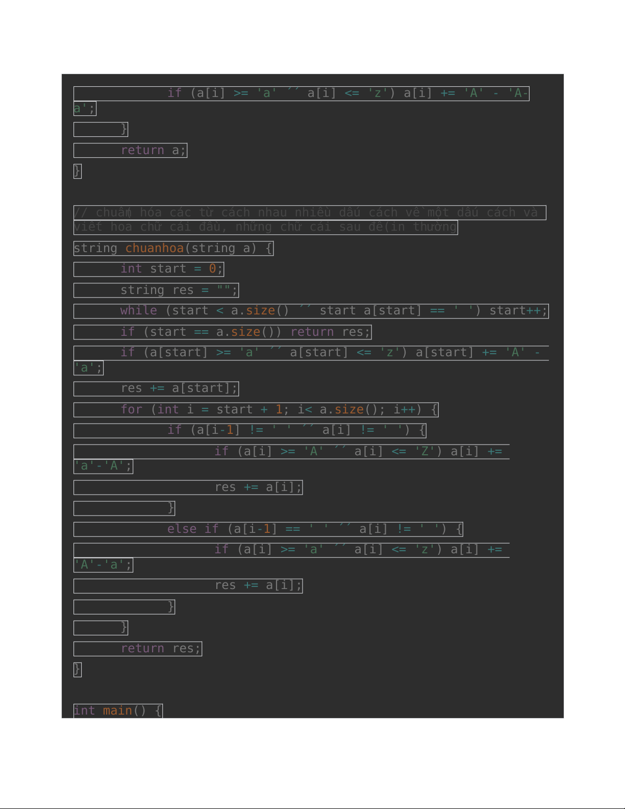 u, những chữ cái sau đế( in thường string chuanhoa(string a) { int start = 0; string res = "";