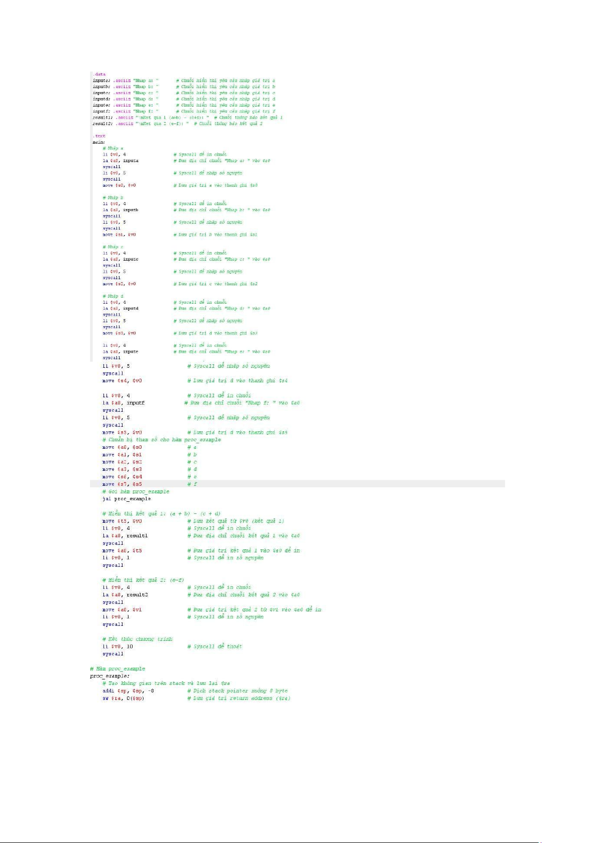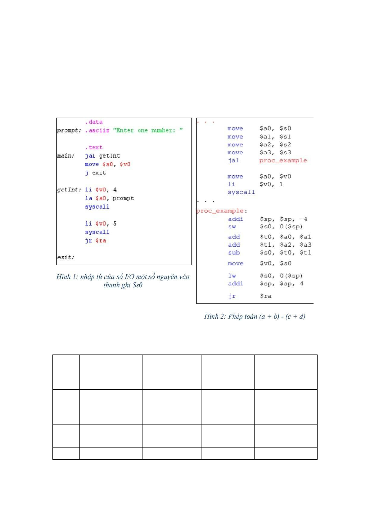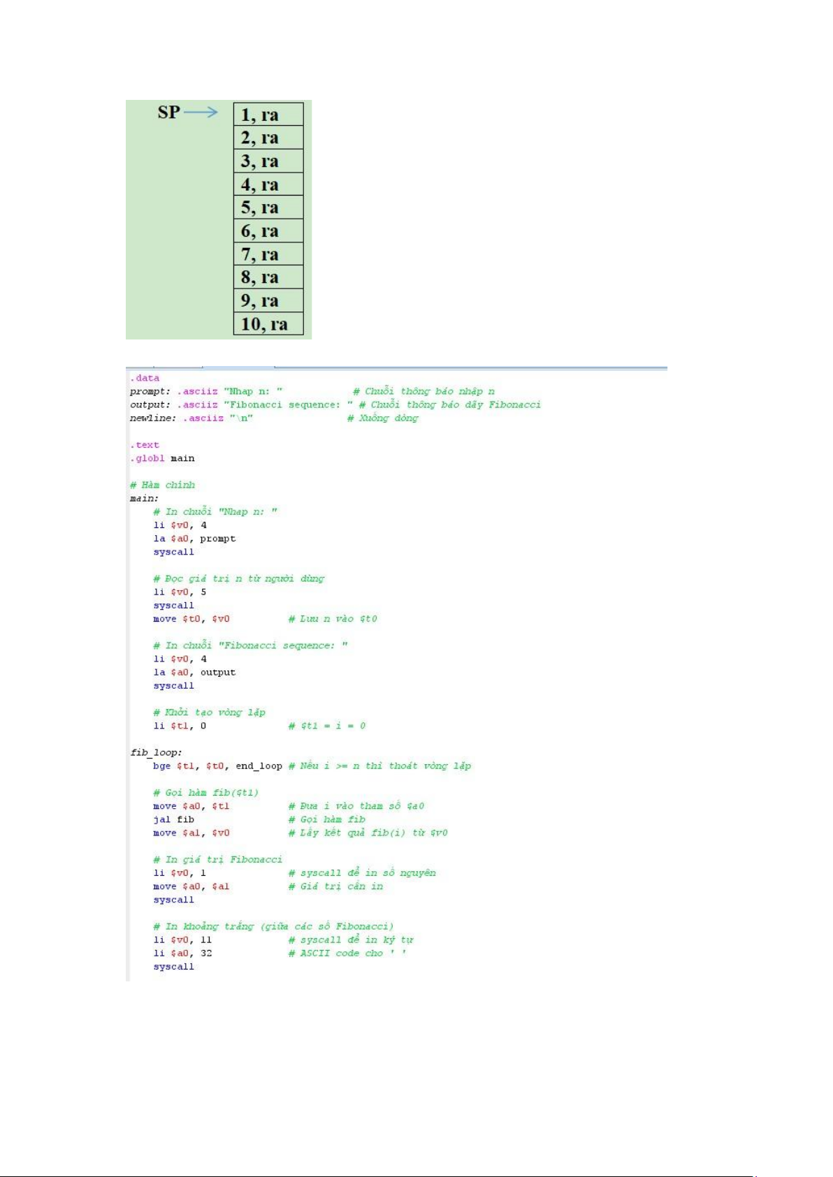 - Chạy từng bước và theo dõi sự thay đổi của thanh ghi PC, $ra, $sp, $fp trong 2 hình trên. Hình 1. Bước PC $ra $sp $fp 1 0x0040001c 0x00400004 0x7fffeffc 0x0000000 2 0x00400020 0x00400004 0x7fffeffc 0x0000000 3 0x00400024 0x00400004 0x7fffeffc 0x0000000 4 0x00400028 0x00400004 0x7fffeffc 0x0000000 5 0x0040002c 0x00400004 0x7fffeffc 0x0000000 6 0x00400030 0x00400004 0x7fffeffc 0x0000000 7 0x00400034 0x00400004 0x7fffeffc 0x0000000 8 0x00400004 0x00400004 0x7fffeffc 0x0000000 lOMoAR cPSD| 59285474 9 0x00400008 0x00400004 0x7fffeffc 0x0000000 Hình 2. Bước PC $ra $sp $fp 1 0x00400070 0x00000000 0x7fffeffc 0x0000000 2 0x00400074 0x00000000 0x7fffeffc 0x0000000 3 0x00400078 0x00000000 0x7fffeffc 0x0000000 4 0x0040007c 0x00000000 0x7fffeffc 0x0000000 5 0x00400080 0x00000000 0x7fffeffc 0x0000000 6 0x004000c8 0x00400084 0x7fffeffc 0x0000000 7 0x004000cc 0x00400084 0x7fffeff4 0x0000000 8 0x004000d0 0x00400084 0x7fffeff4 0x0000000 9 0x004000d4 0x00400084 0x7fffeff4 0x0000000 10 0x004000d8 0x00400084 0x7fffeff4 0x0000000 11 0x004000dc 0x00400084 0x7fffeff4 0x0000000 12 0x004000e0 0x00400084 0x7fffeff4 0x0000000 13 0x004000e4 0x00400084 0x7fffeff4 0x0000000 14 0x004000e8 0x00400084 0x7fffeff4 0x0000000 15 0x004000ec 0x00400084 0x7fffeff4 0x0000000 16 0x004000f0 0x00400084 0x7fffeff4 0x0000000