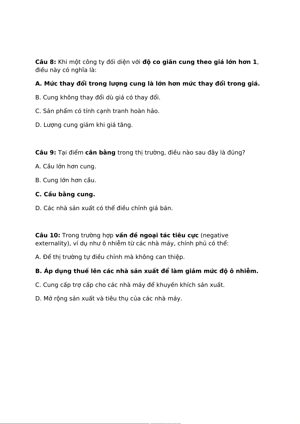 Câu 9: Tại điểm cân bằng trong thị trường, điều nào sau đây là đúng? A. Cầu lớn hơn cung. B. Cung lớn hơn cầu. C. Cầu bằng cung.