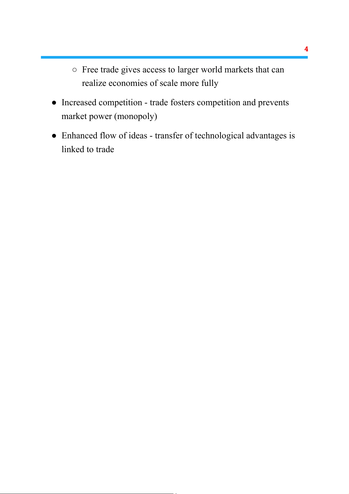 ● Increased competition - trade fosters competition and prevents market power (monopoly)