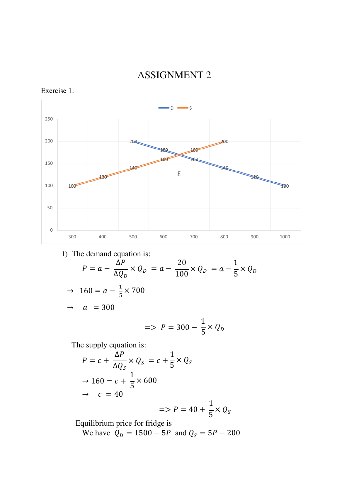 ASSIGNMENT 2 Exercise 1: D S 250 200 200 200 180 180 160 160 150 140 140 E 120 120 100 100 100 50 0 300 400 500 600 700 800 900 1000 1) The demand equation is: Δ𝑃 20 1 𝑃 = 𝑎 − × 𝑄 × 𝑄 × 𝑄 Δ𝑄 𝐷 = 𝑎 − 𝐷 = 𝑎 − 𝐷 𝐷 100 5 1 → 160 = 𝑎 − × 700 5 → 𝑎 = 300 1 => 𝑃 = 300 − × 𝑄 5 𝐷 The supply equation is: Δ𝑃 1 𝑃 = 𝑐 + × 𝑄 × 𝑄 Δ𝑄 𝑆 = 𝑐 + 5 𝑆 𝑆 1 → 160 = 𝑐 + × 600 5 → 𝑐 = 40 1 => 𝑃 = 40 + × 𝑄 5 𝑆