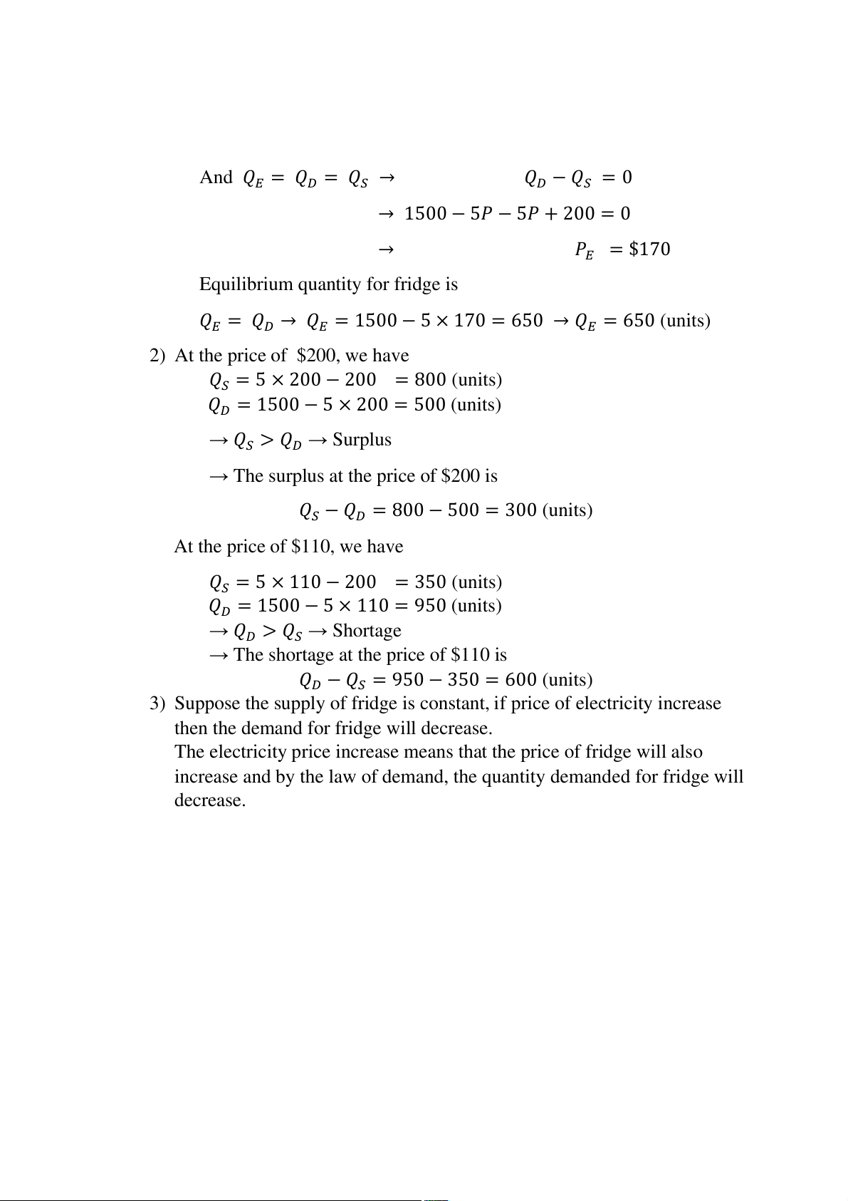𝑄𝐸 = 𝑄𝐷 → 𝑄𝐸 = 1500 − 5 × 170 = 650 → 𝑄𝐸 = 650 (units)