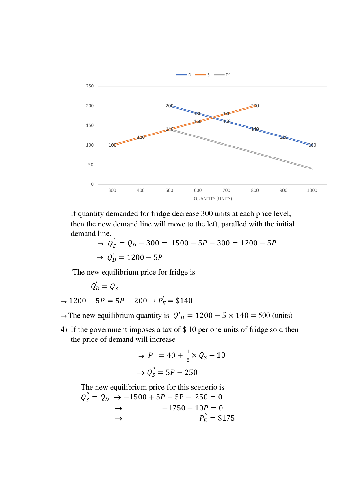increase and by the law of demand, the quantity demanded for fridge will decrease. D S D' 250 200 200 200 180 180 160 160 150 140 140 120 120 PRICE ($) 100 100 100 50 0 300 400 500 600 700 800 900 1000 QUANTITY (UNITS)