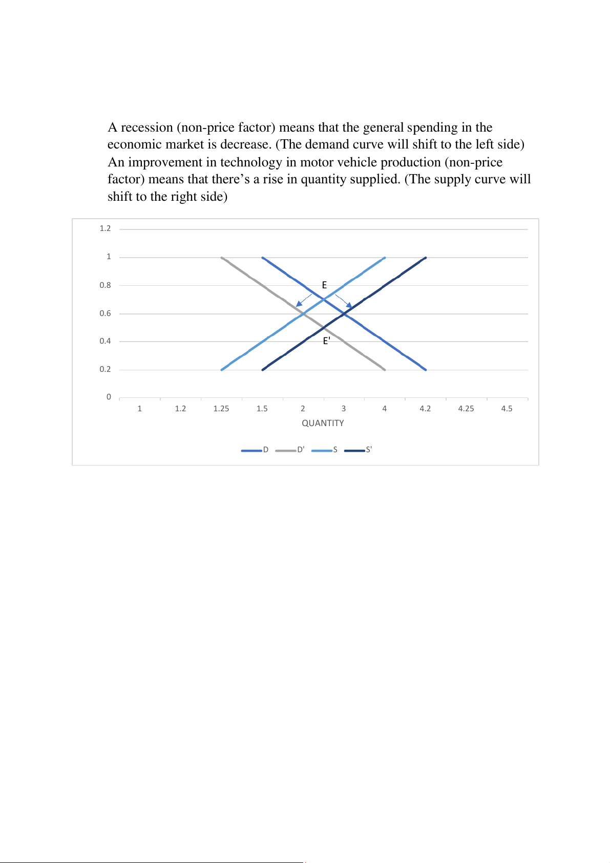 factor) means that there’s a rise in quantity supplied. (The supply curve will shift to the right side) 1.2 1 0.8 E ICE 0.6 R P 0.4 E' 0.2 0 1 1.2 1.25 1.5 2 3 4 4.2 4.25 4.5 QUANTITY D D' S S'