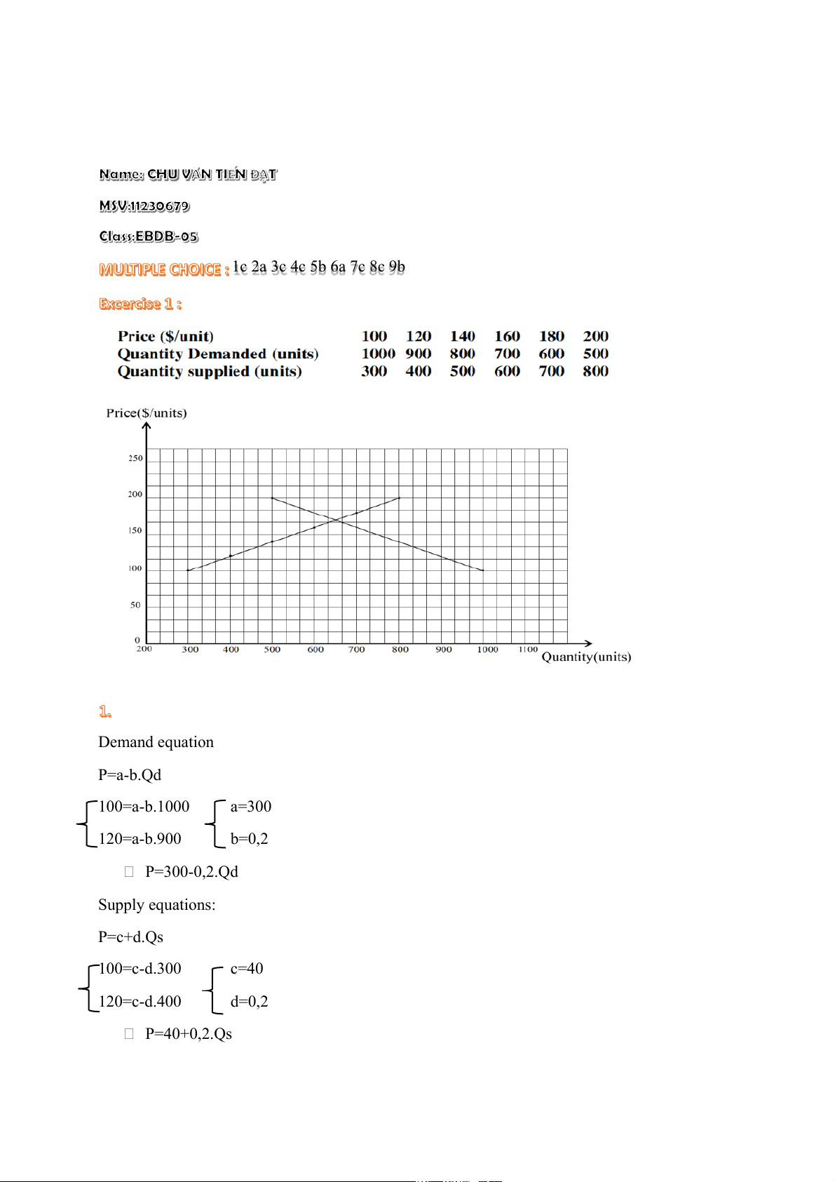 1c 2a 3c 4c 5b 6a 7c 8c 9b Demand equation P=a-b.Qd 100=a-b.1000 a=300 120=a-b.900 b=0,2 P=300-0,2.Qd Supply equations: P=c+d.Qs 100=c-d.300 c=40 120=c-d.400 d=0,2 P=40+0,2.Qs