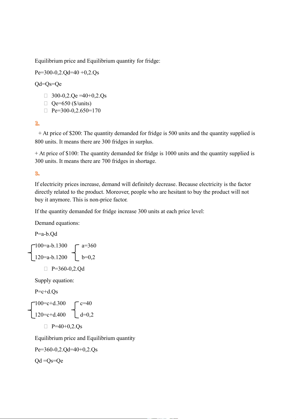Equilibrium price and Equilibrium quantity for fridge: Pe=300-0,2.Qd=40 +0,2.Qs Qd=Qs=Qe 300-0,2.Qe =40+0,2.Qs Qe=650 ($/units) Pe=300-0,2.650=170