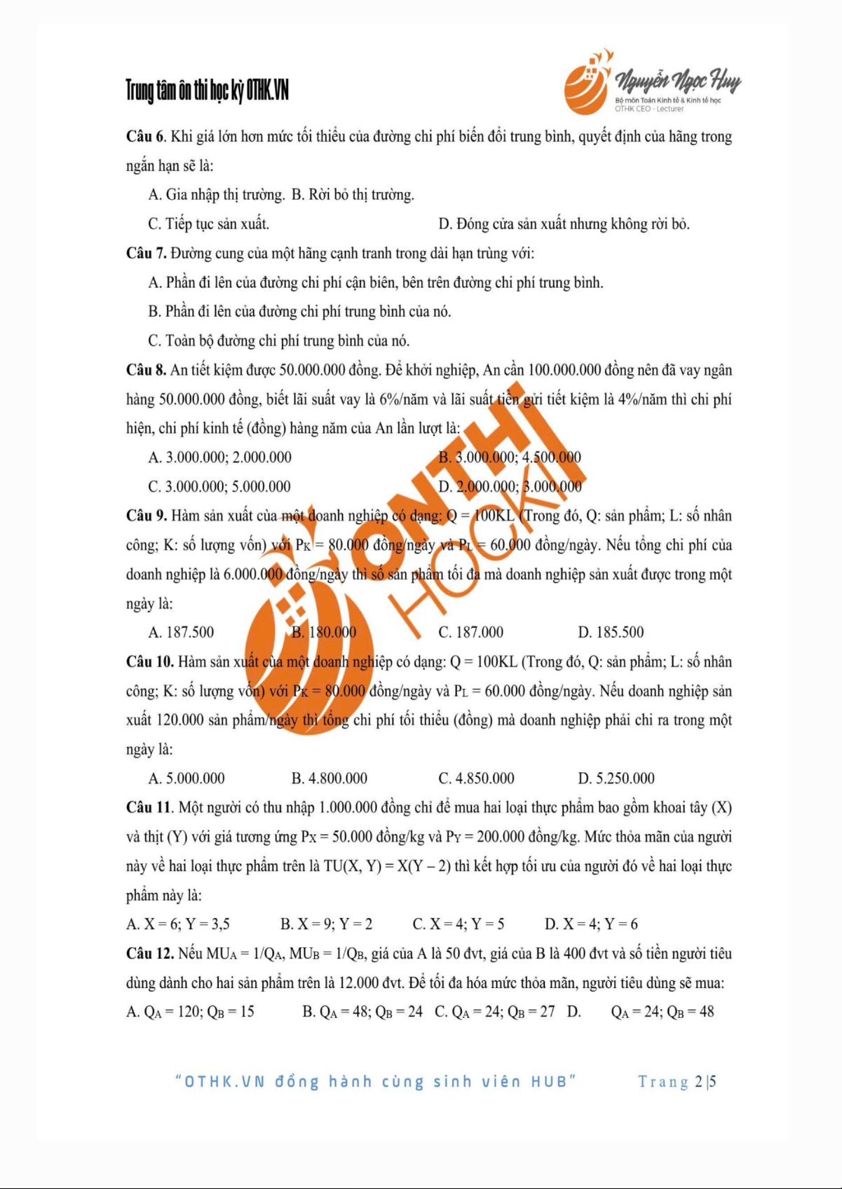 Câu 6. Phát biểu nào sau đây phù hợp không thuộc về kinh tế vi mô