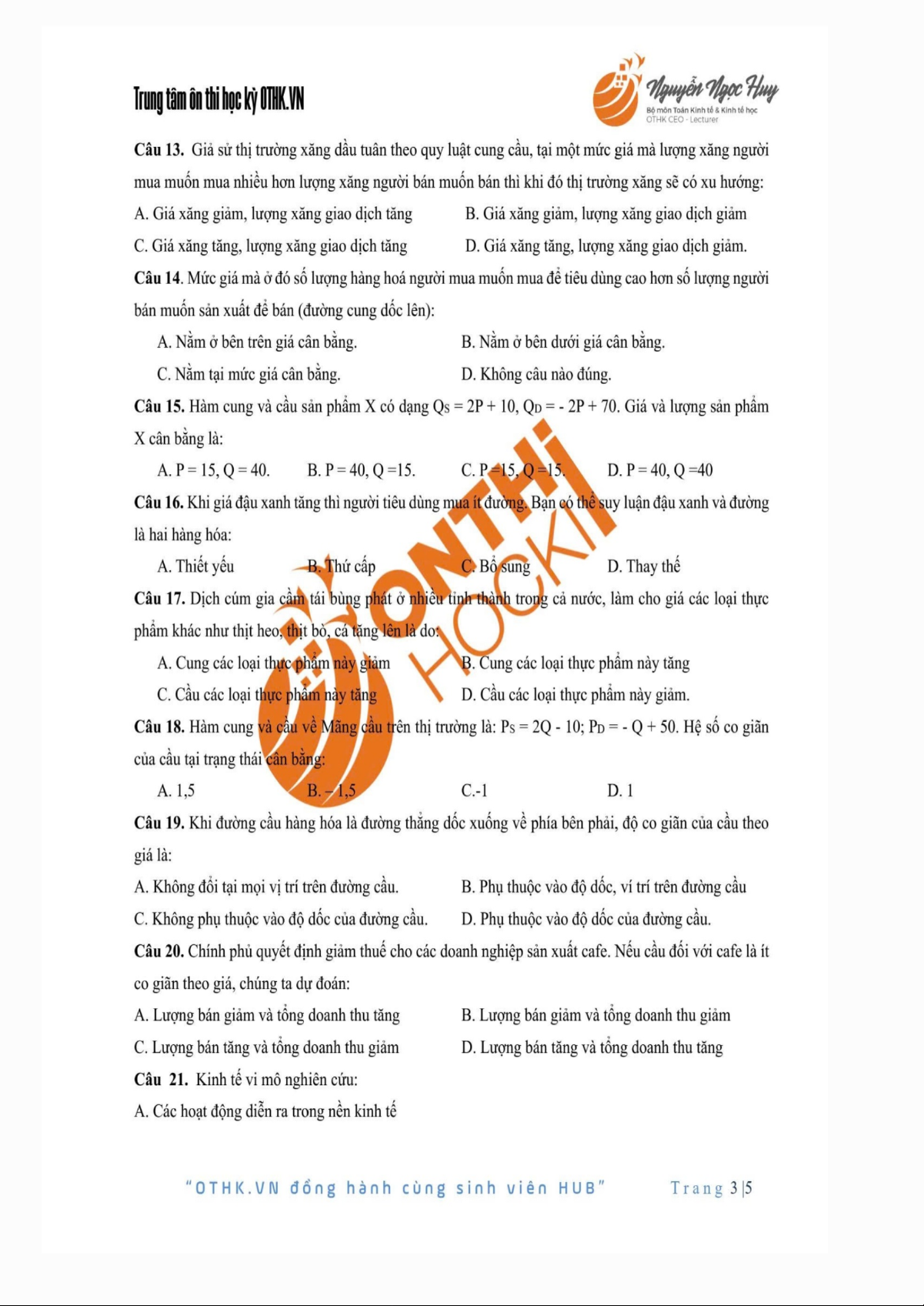 Câu 19: Giả sử cho hàm số cung cầu của sản phẩm nước khoáng thiên nhiên