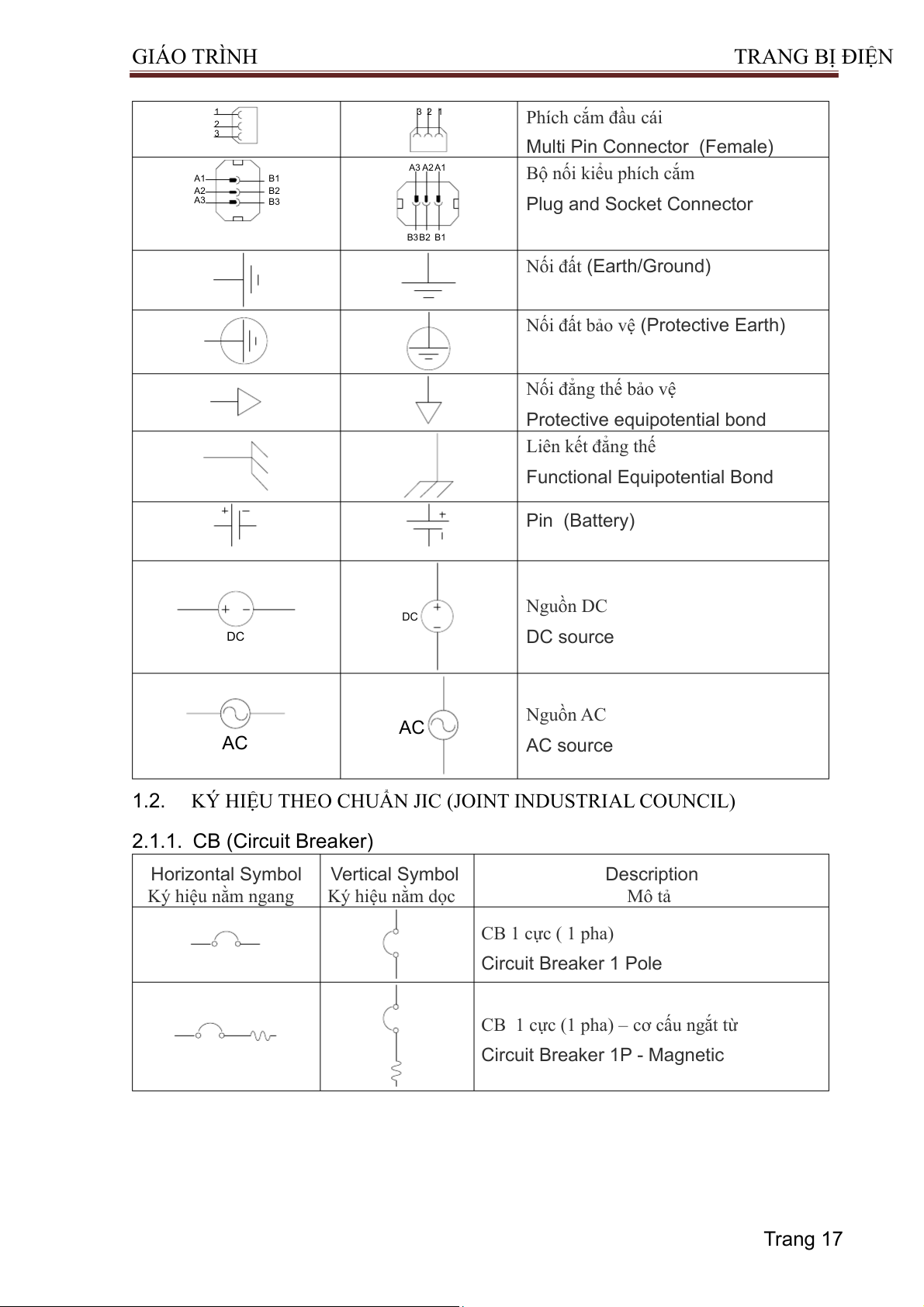 1.2. KÝ HIỆU THEO CHUẨN JIC (JOINT INDUSTRIAL COUNCIL) 2.1.1. CB (Circuit Breaker) Horizontal Symbol Vertical Symbol Description Ký hiệu nằm ngang Ký hiệu nằm dọc Mô tả CB 1 cực ( 1 pha) Circuit Breaker 1 Pole