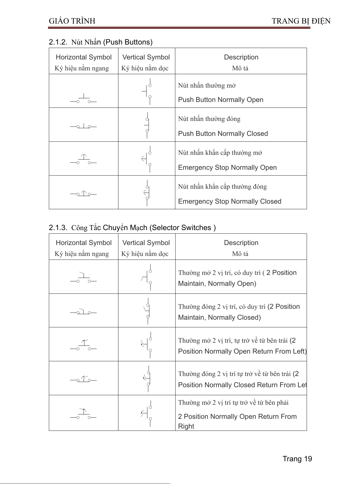 (Circuit Breaker 3P- Thermal/Magnetic) Trang 18 GIÁO TRÌNH TRA NG BỊ ĐIỆN 2.1.2. Nút Nhấn ( Push Buttons) Horizontal Symbol Vertical Symbol Description Ký hiệu nằm ngang Ký hiệu nằm dọc Mô tả Nút nhấn thường mở Push Button Normally Open Nút nhấn thường đóng Push Button Normally Closed