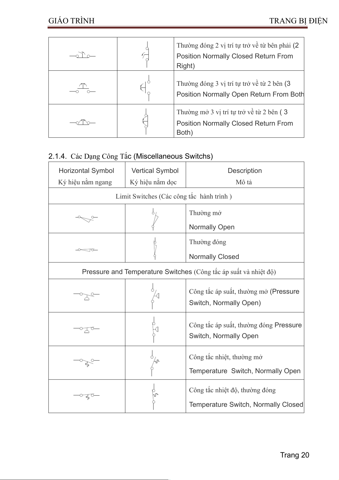 2.1.4. Các Dạng Công Tắc (Miscel aneous Switchs) Horizontal Symbol Vertical Symbol Description Ký hiệu nằm ngang Ký hiệu nằm dọc Mô tả