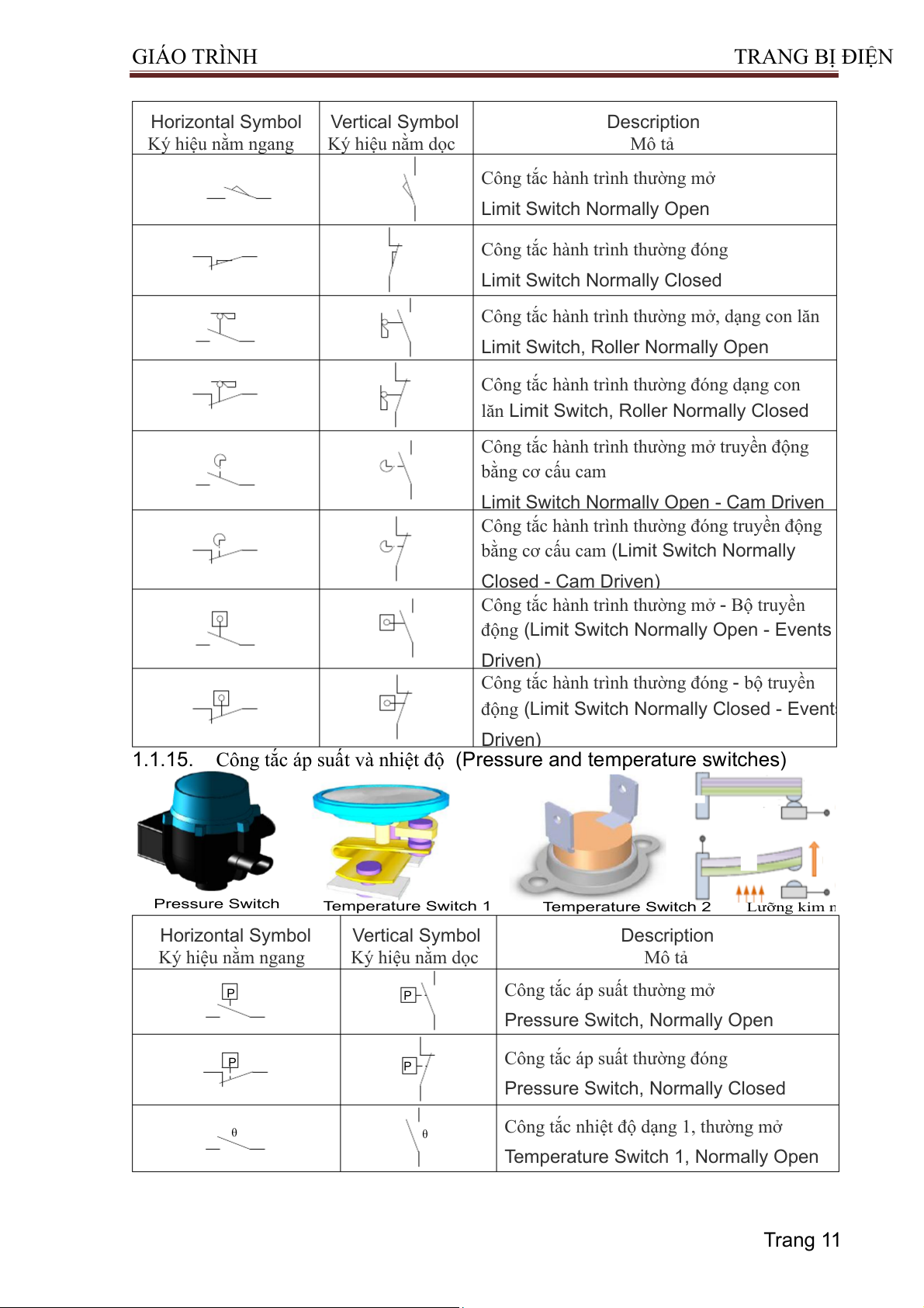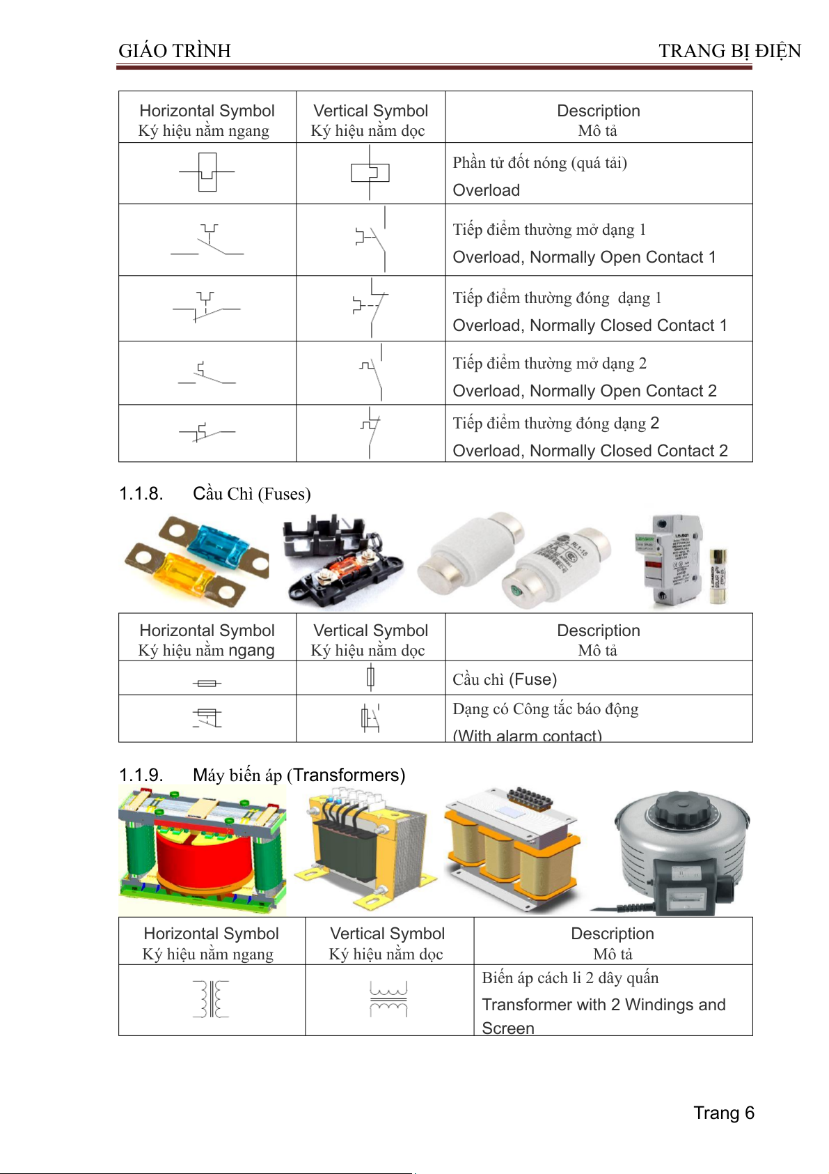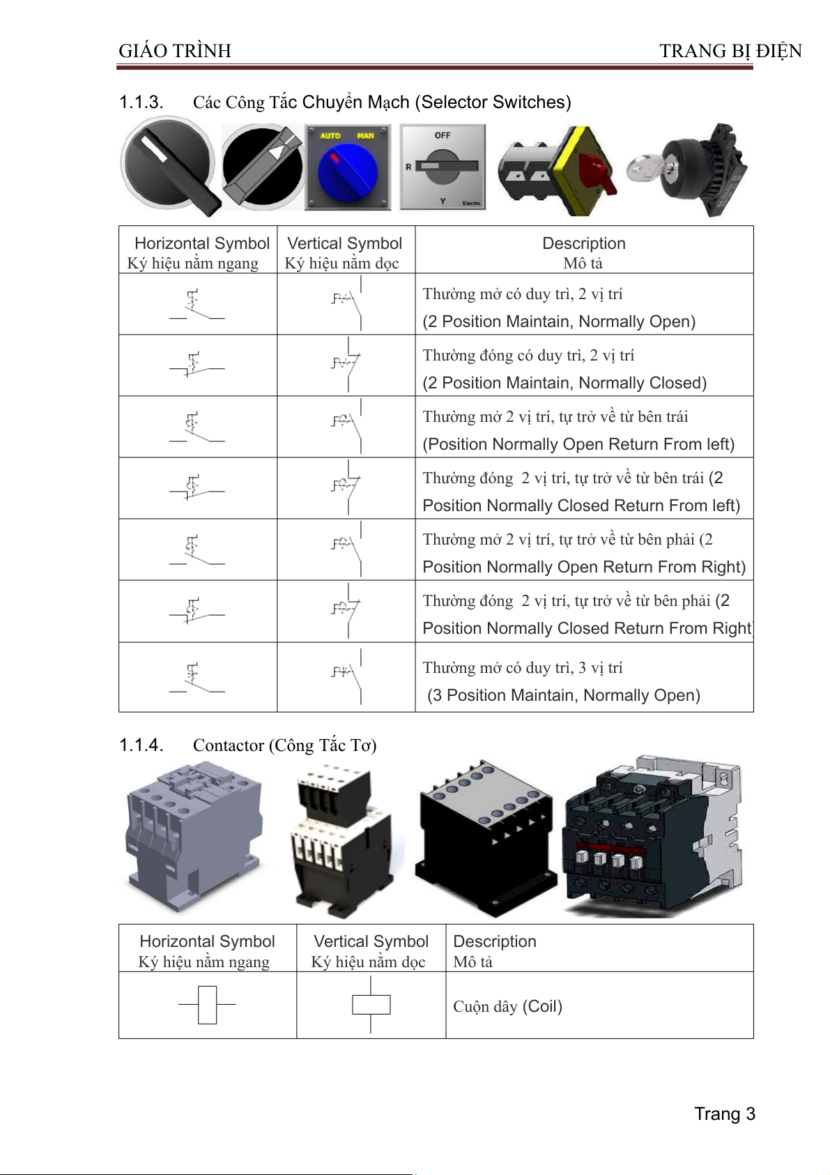 (3 Position Maintain, Normally Open) 1.1.4. Contactor (Công Tắc Tơ) Horizontal Symbol Vertical Symbol Description Ký hiệu nằm ngang Ký hiệu nằm dọc Mô tả Cuộn dây (Coil) Trang 3 GIÁO TRÌNH TRA NG BỊ ĐIỆN
