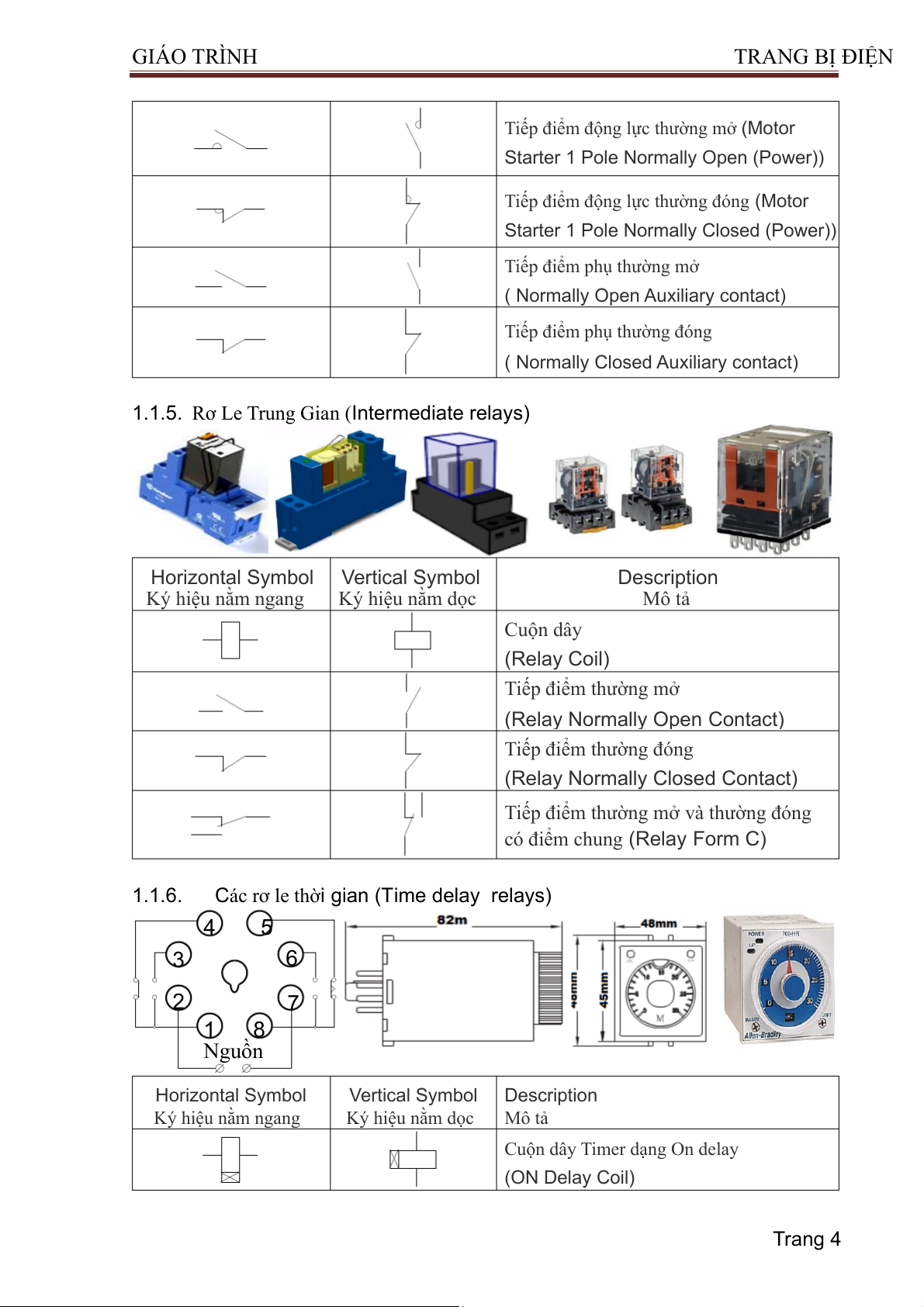 Các rơ le thời gian (Time delay relays) 4 5 3 6 2 7 1 8 Nguồn Horizontal Symbol Vertical Symbol Description Ký hiệu nằm ngang Ký hiệu nằm dọc Mô tả