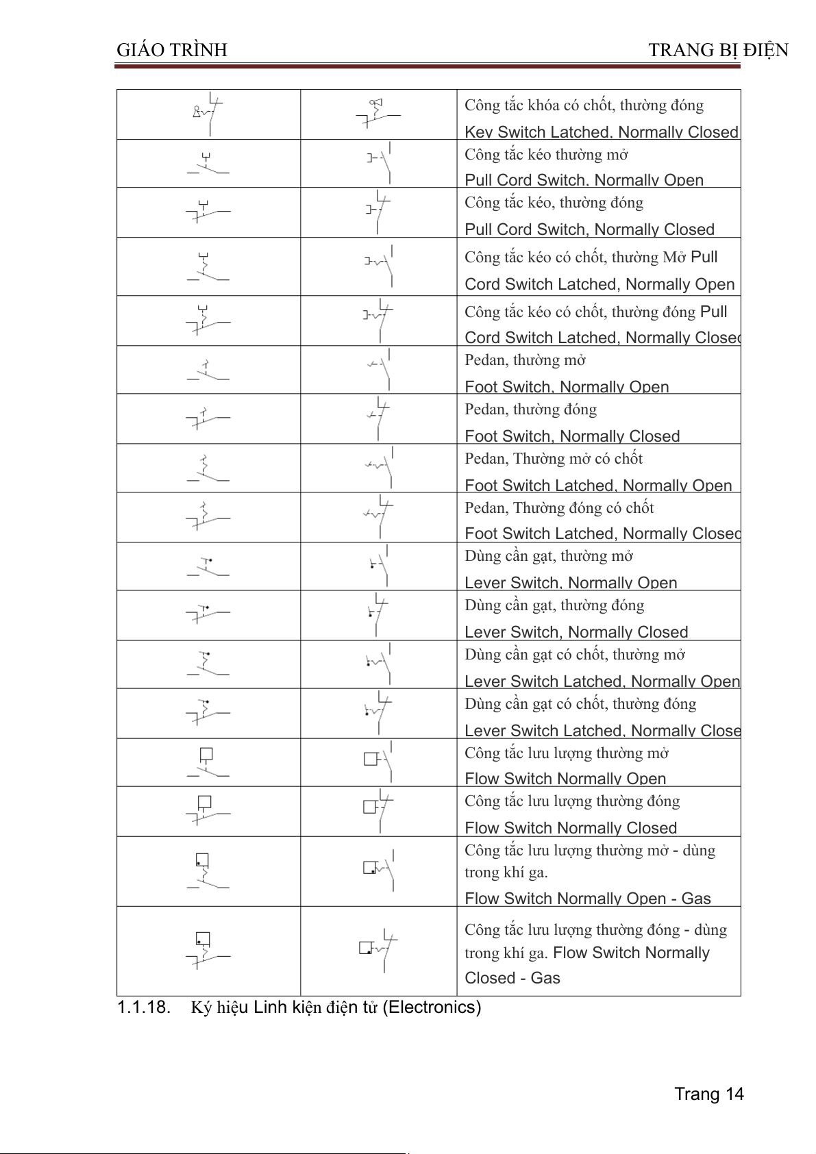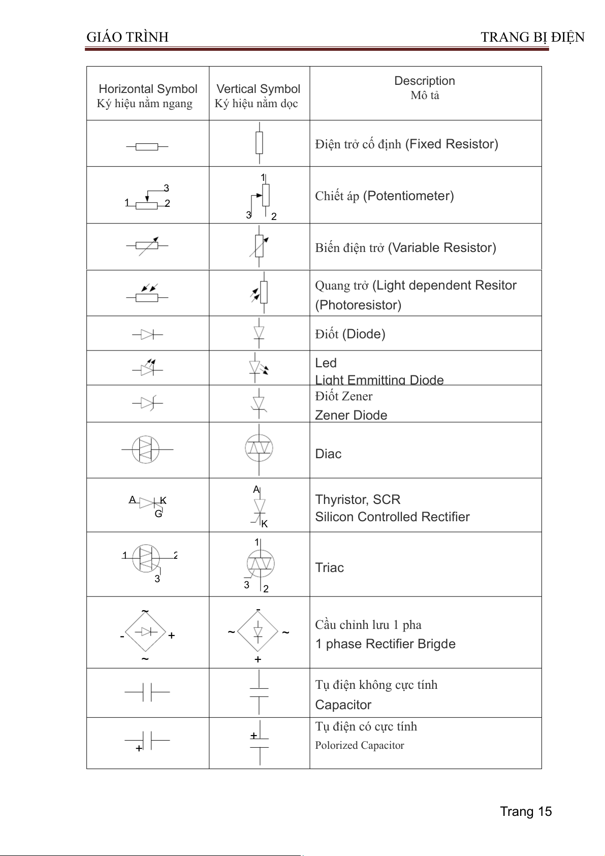 1.1.18. Ký hiệu Linh kiện điện tử (Electronics) Trang 14 GIÁO TRÌNH TRA NG BỊ ĐIỆN Description Horizontal Symbol Vertical Symbol Mô tả Ký hiệu nằm ngang Ký hiệu nằm dọc