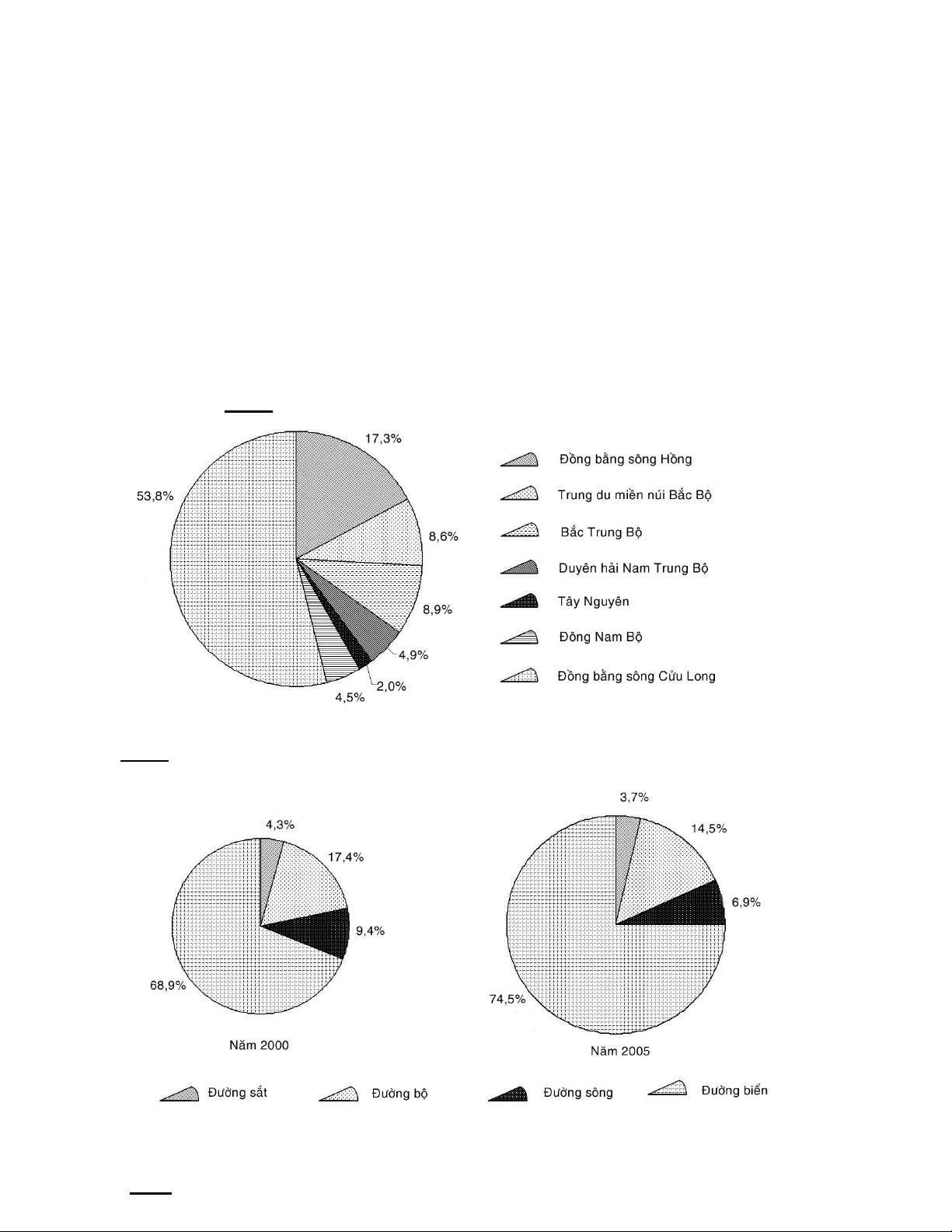 Ví dụ:Biểu đồ cơ cấu khối lượng luân chuyển hàng hoá phân theo các loại hình vận tải, năm 2000 và năm 2005