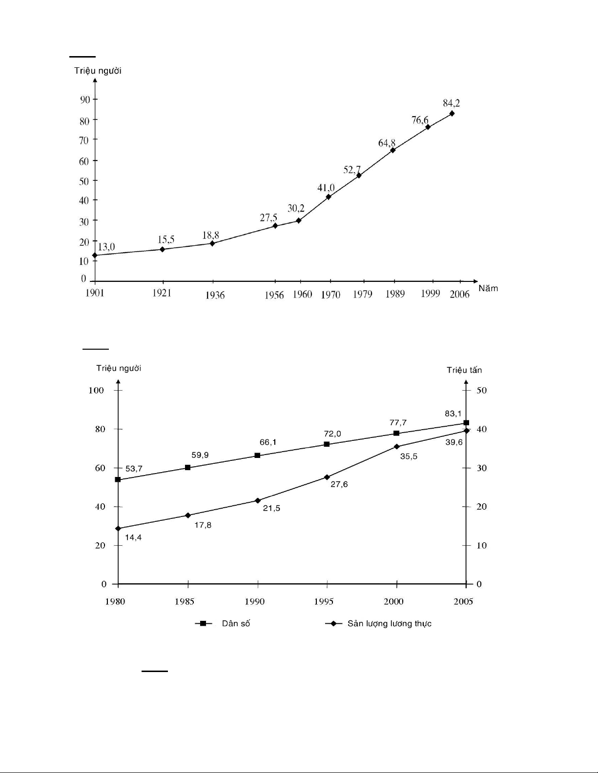 (Đơn vị: triệu người) Năm Số dân Năm Số dân 1901 13,0 1970 41,0 1921 15,5 1979 52,7 1936 18,8 1989 64,8 1956 27,5 1999 76,6 1960 30,2 2006 84,2