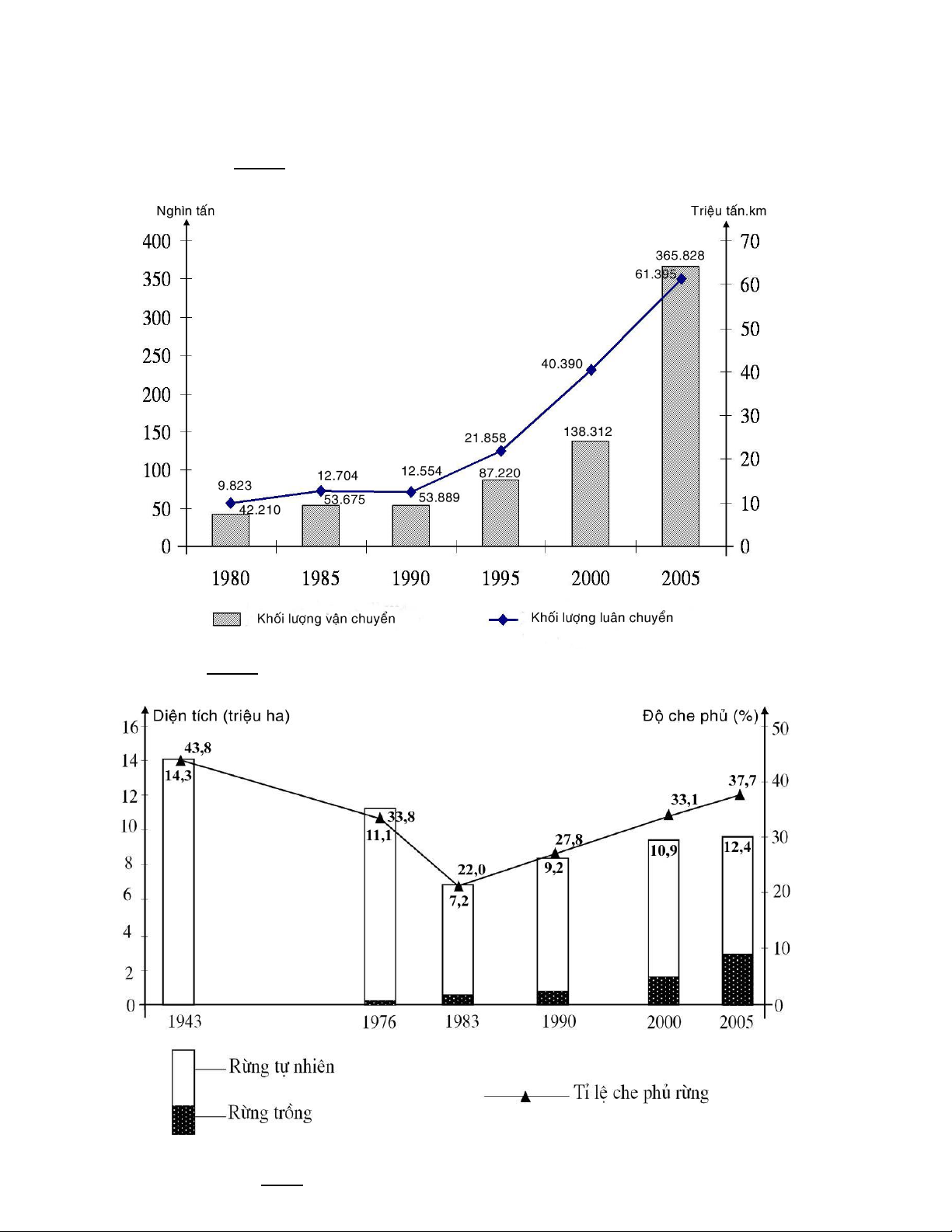 Ví dụ2: Biểu đồ thể hiện sự biến đổi diện tích rừng và độ che phủ rừng ở nước ta