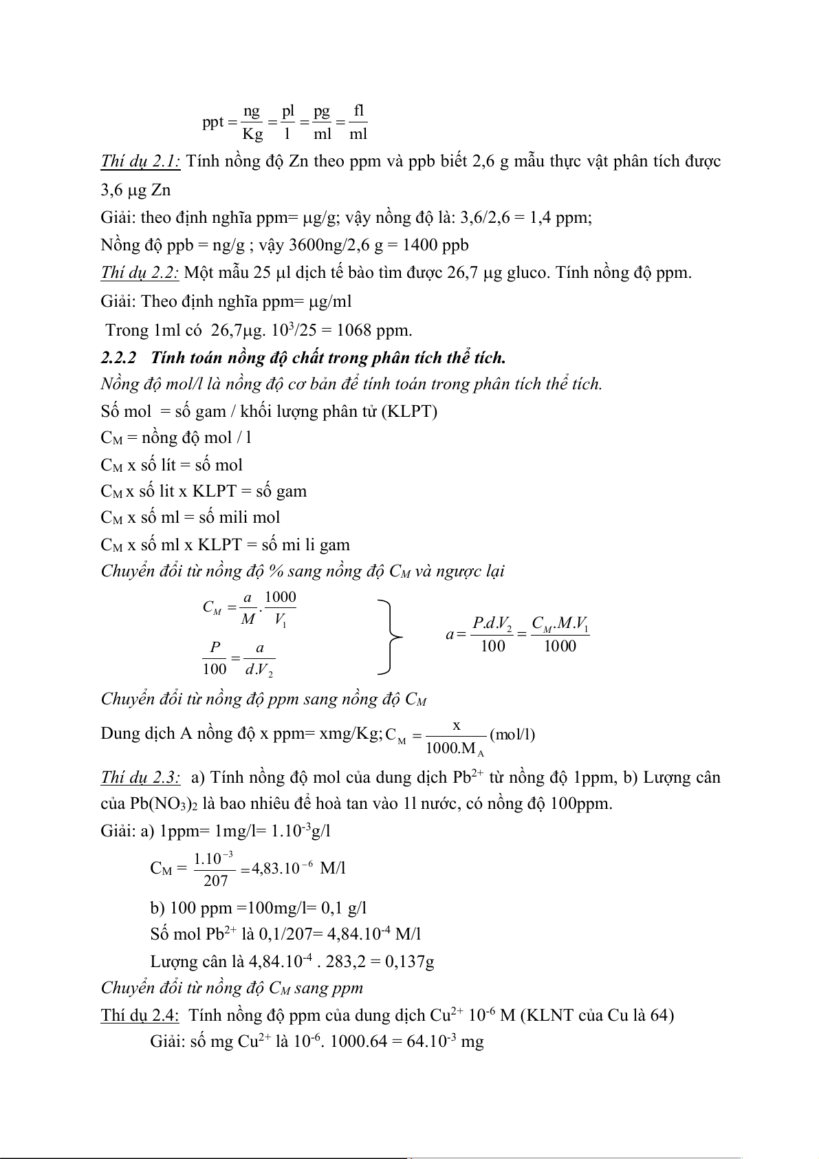 Thí dụ 2.1: Tính nồng độ Zn theo ppm và ppb biết 2,6 g mẫu thực vật phân tích được 3,6 µg Zn