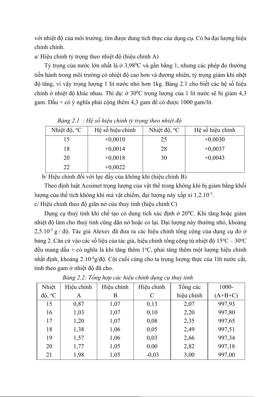 Bảng 2.2: Tổng hợp các hiệu chỉnh dụng cụ thuỷ tinh Nhiệt Hiệu chỉnh Hiệu chỉnh Hiệu chỉnh Tổng các 1000- độ, oC A B C hiệu chỉnh (A+B+C) 15 0,87 1,07 0,13 2,07 997,93 16 1,03 1,07 0,10 2,20 997,80 17 1,20 1,07 0,08 2,35 997,65 18 1,38 1,06 0,05 2,49 997,51 19 1,57 1,06 0,03 2,66 997,34 20 1,77 1,05 0,00 2,82 997,18 21 1,98 1,05 -0,03 3,00 997,00 22 2,20 1,05 -0,05 3,20 996,80 23 2,43 1,04 -0,08 3,39 996,61 24 2,67 1,04 -0,10 3,61 996,39 25 2,92 1,03 -0,13 3,82 996,18 26 3,18 1,03 -0,15 4,06 995,94 27 3,45 1,03 -0,18 4,30 995,70 28 3,73 1,02 -0,20 4,55 995,45 29 4,02 1,02 -0,23 4,81 995,14 30 4,32 1,01 -0,25 5,08 994,92